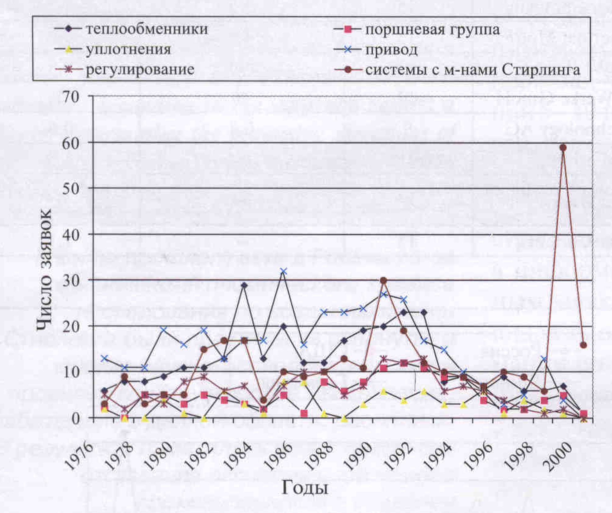 Для выявления тенденций развития и перспективных направлений исследовательских работ по машинам Стирлинга на период до 2010 г. применялась трендовая модель патентной динамики, основанная на экстраполяции временного ряда подачи заявок.