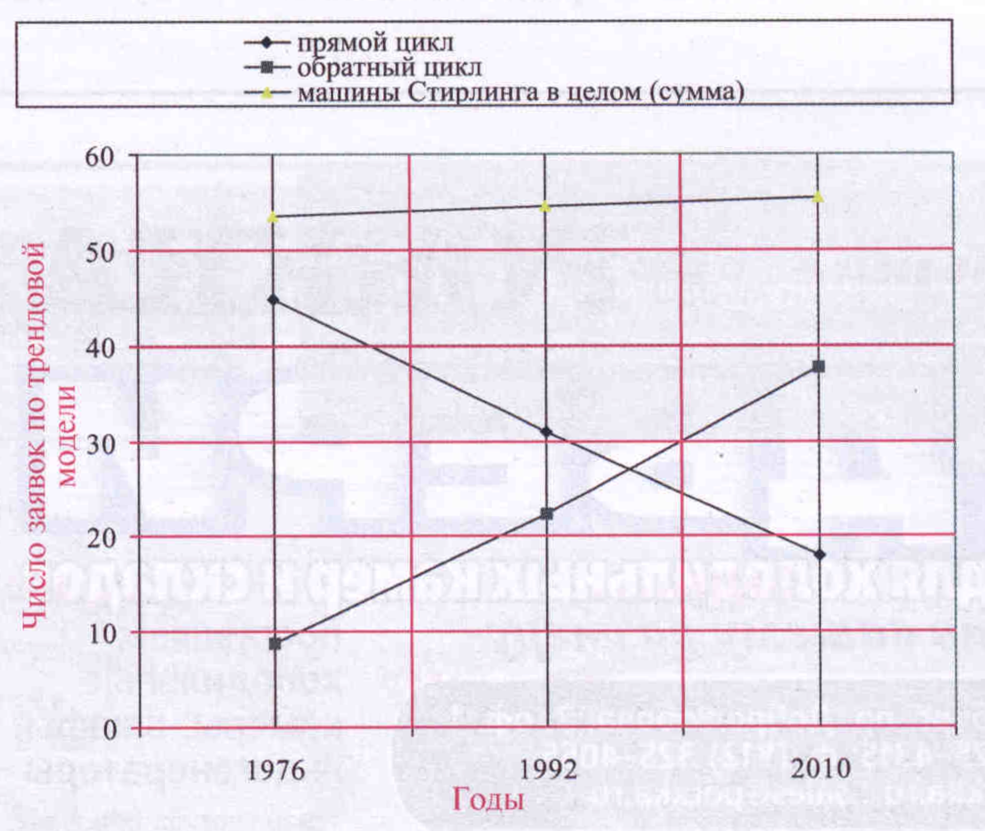 - представленная на рис. 5 общая тенденция развития машин Стирлинга (прямой цикл+обратный цикл) подтверждает ранее сделанное предположение о возрастании изобретательской активности в данной области к 2010 г.