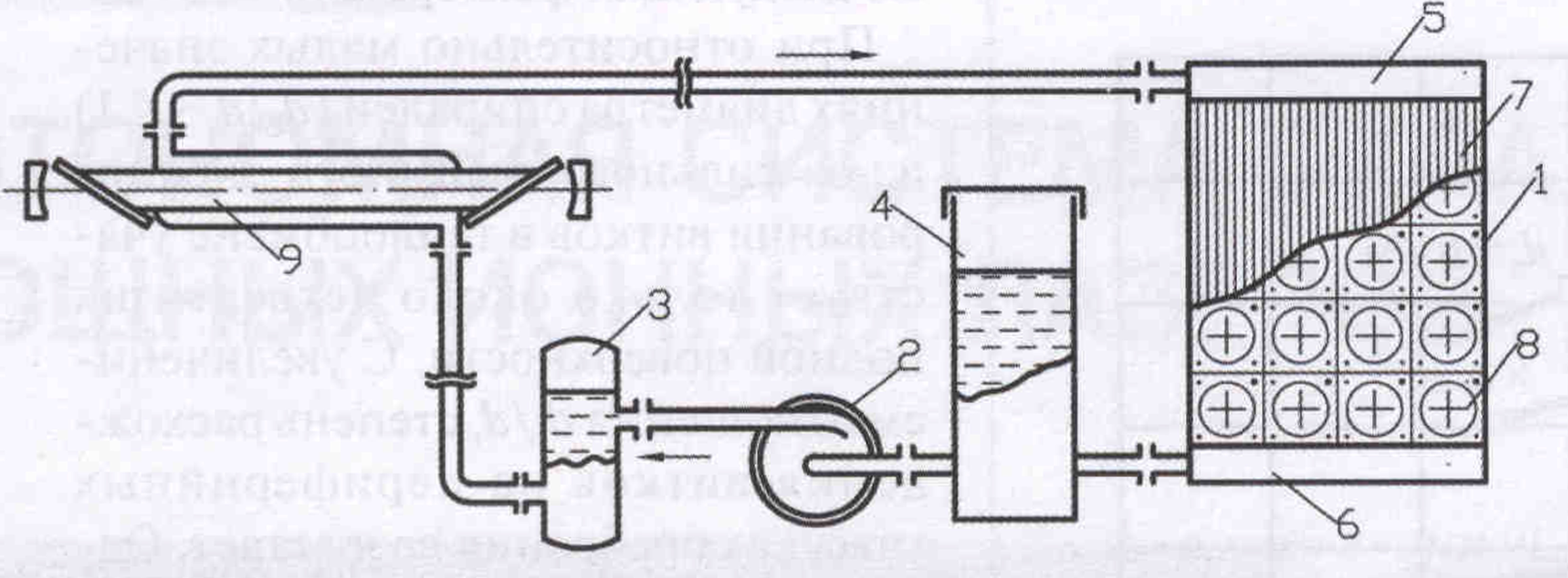 Рис. 3. Автономная система охлаждения газовых лазеров: 1 — теплообменник; 2 — центробежный нагнетатель; 3 — стабилизатор пульсаций потока жидкости; 4 — резервуар с запасом теплоносителя внутреннего контура; 5, 6 — верхний и нижний коллекторы; 7 — теплорассеивающие элементы; 8 — осевые вентиляторы; 9 — активный элемент лазера