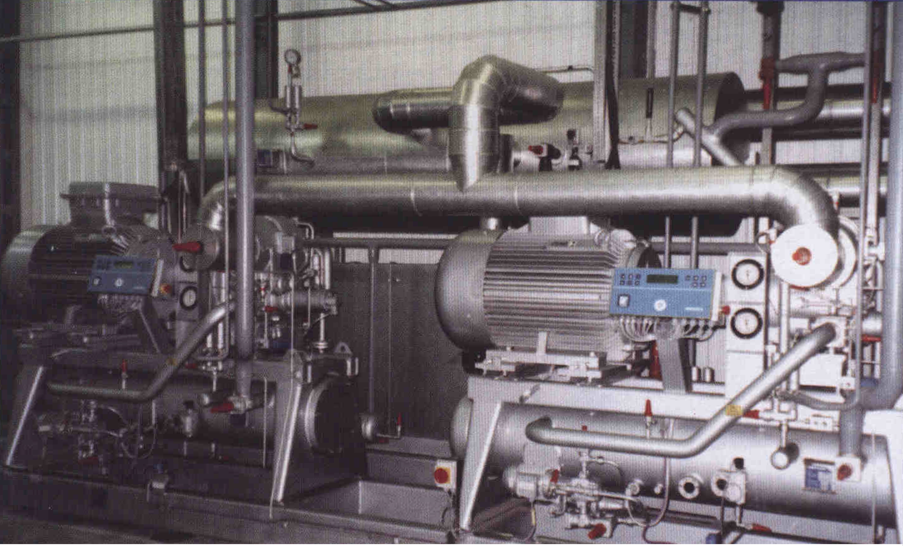 Установка для приготовления водного раствора пропиленгликоля, предназначенного для холодоснабжения камер хранения молочной продукции, имеет общую холодопроизводительность 450 кВт. Она создана на базе поршневой холодильной машины YCAS (YORK) с несколькими независимыми холодильными контурами, что дает возможность проводить сервисное обслуживание одного из них без остановки всей системы.