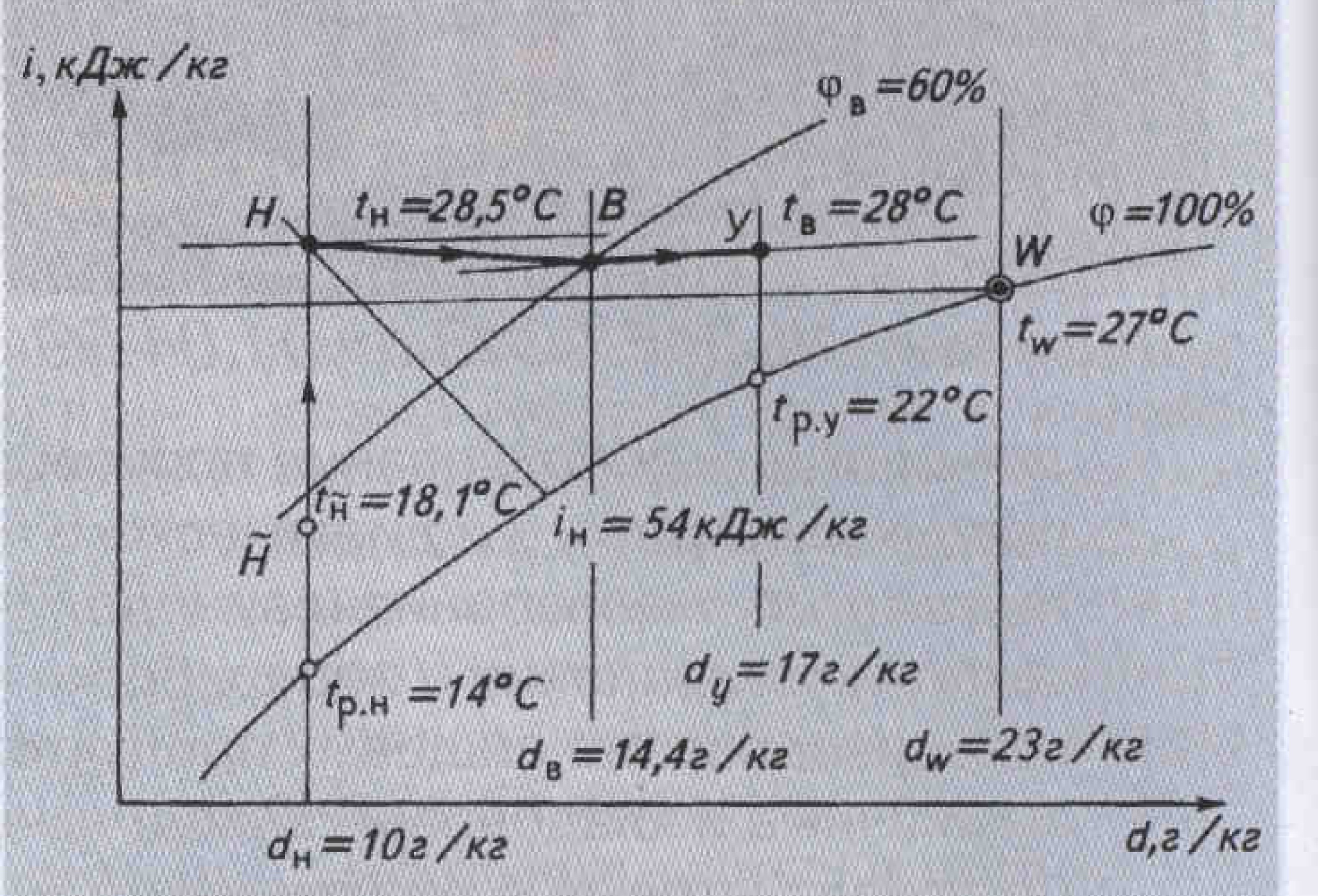 На диаграмме (см. рис. 1) находим dn = 23 г/кг (точка ИО и du = 14,4 г/кг (точка В).