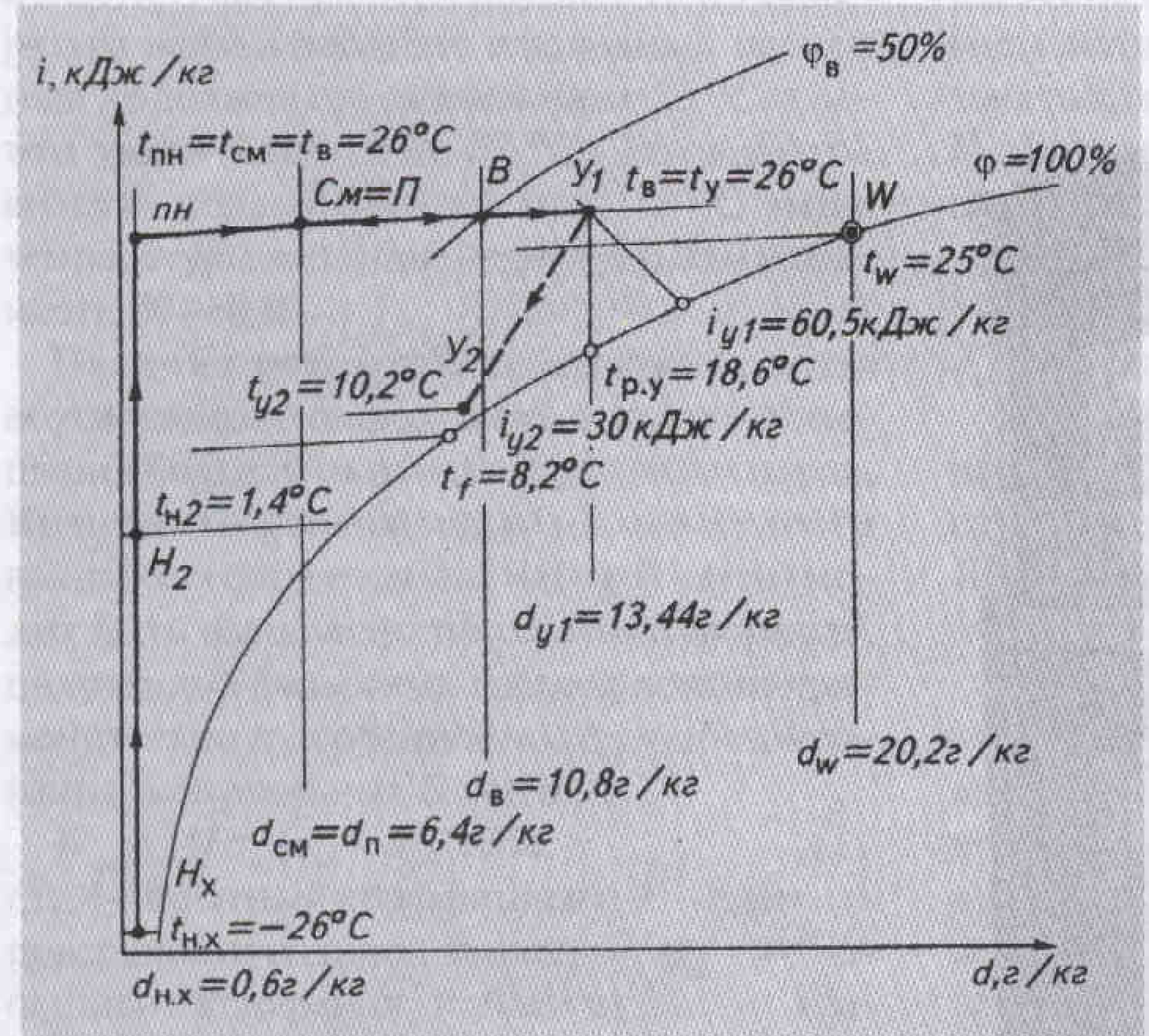 На рис. 2 представлено пост роение на -диаграмме расчет ного режима работы системы микроклимата в холодный пери од года при параметрах Б [3]: = -26 °C, d, х = 0,6 г/кг; температура волы tи, = 25 °C, dw = = 20,2 г/кг; тем!icpaгура воздуха tв = 26 °C, da — 10,8 г/кг, относительная влажность 50 %.