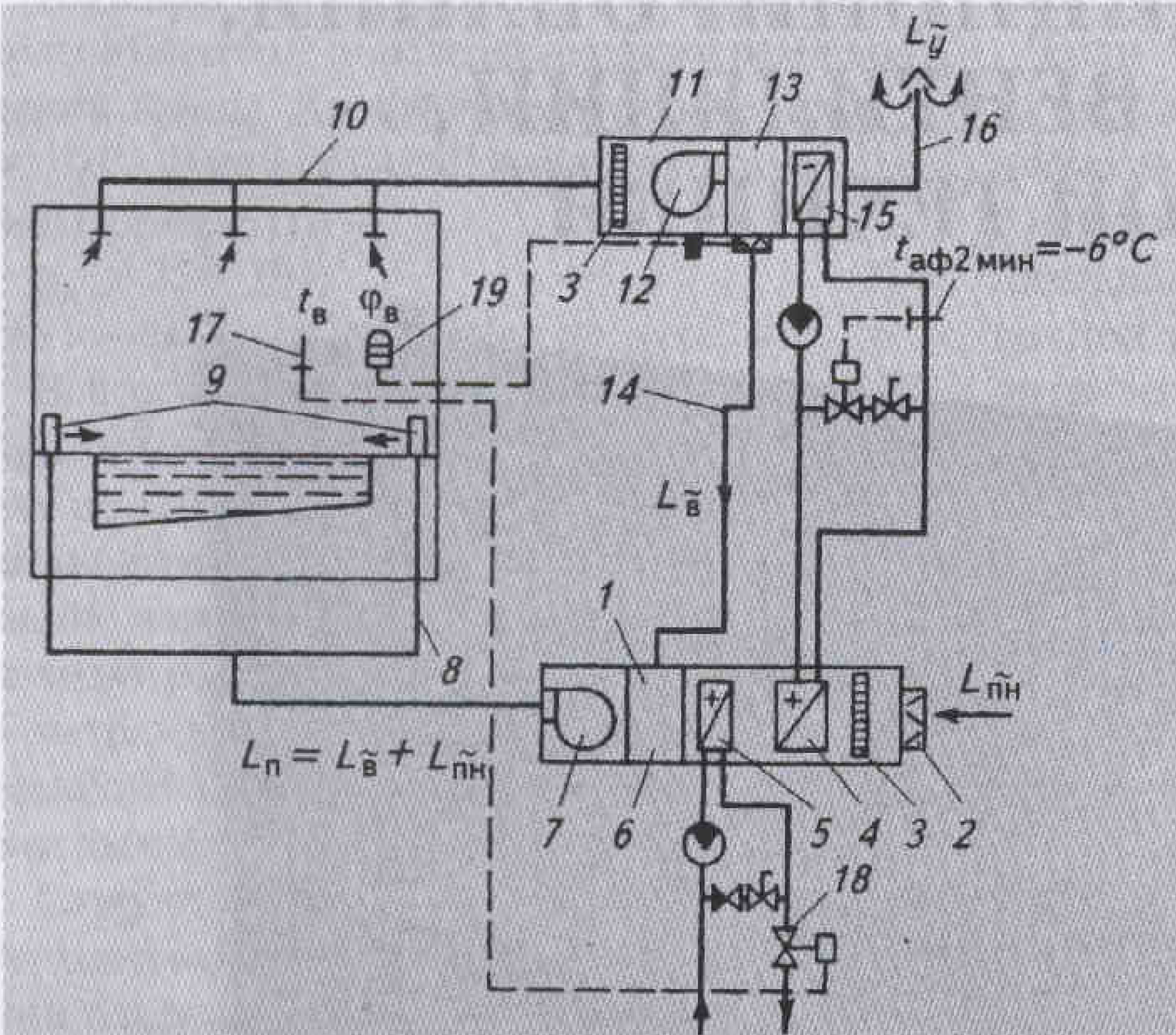 В помещении плавательного бассейна термостат контролирует температуру воздуха и в июне нахождения людей и через импульсную связь воздействует на автоматический клапан 18 изменения расхода горя чей воды через калорифер 5. Датчик 9 контролирует влажность воздуха в зоне на хождения людей и через импульсную связь воздействует на моторный привод воздушных клапанов у воздушной камеры 15. При снижении относительной влажности воздуха до нижнего уровня 50 % воздушные клапаны камеры 13 открыты для пропуска по соединительному воздуховоду 14 на рециркуляцию до 50 % удаляемого воздуха, который смешивается с подогретым приточным наружным воздухом в камере 6 приточного агрегата. При достижении верхнего уровня относительной влажности воздуха 60 % в зоне нахождения людей датчик Р подаст команду на закрытие воздушных клапанов у воздушной камеры 15, после чего приточный агрегат работает по прямоточной схеме. На схеме (рис. 3) не показаны нагревательные приборы, которые должны поддерживать температуру па поверхности ограждений помещения плавательного бассейна выше температуры точки росы удаляемого влажного воздуха (см. рис. 1 и 2).