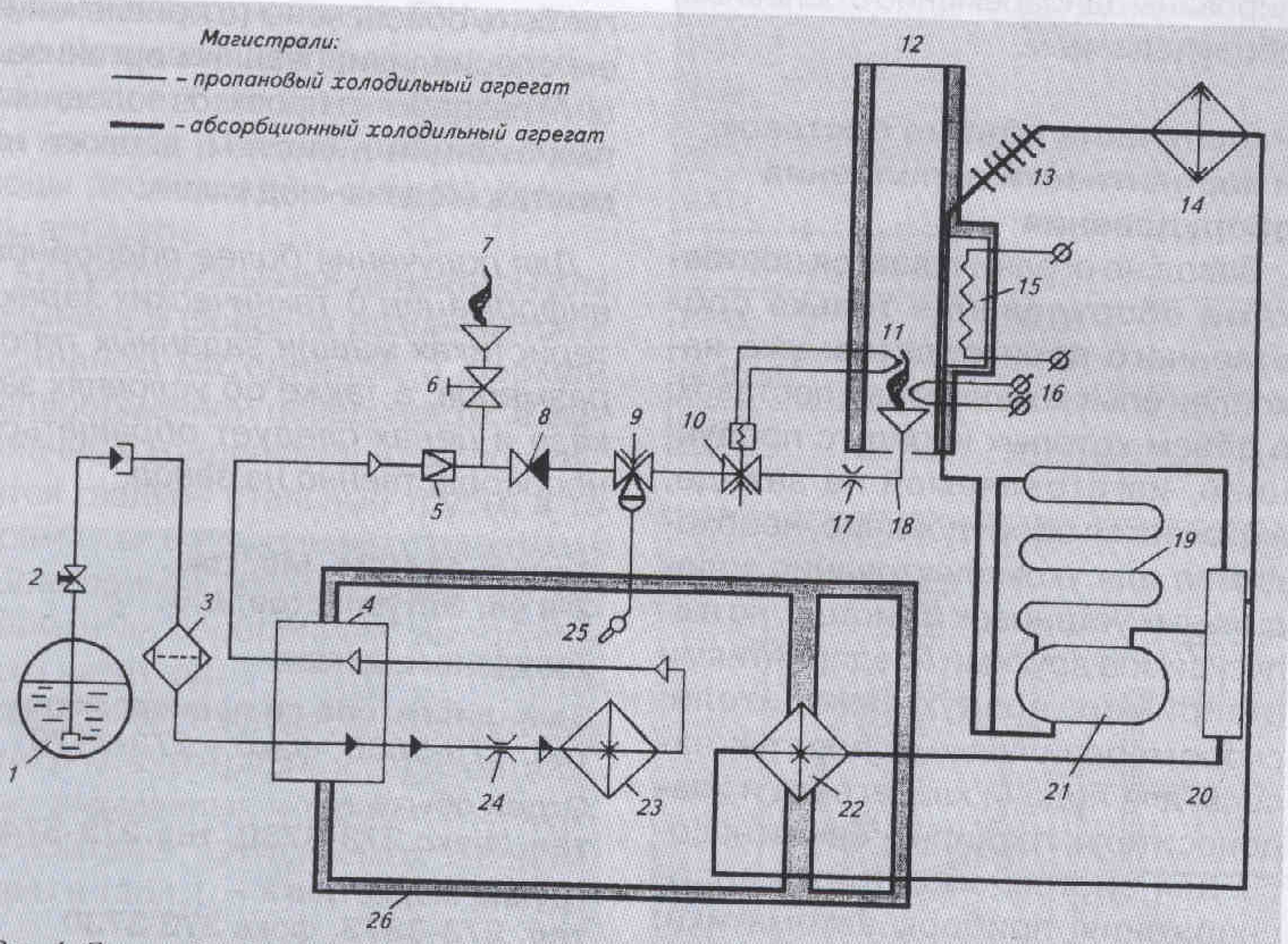 Рис. 1. Схема абсорбционного холодильника с пропановым холодильным агрегатом: 1 — баллон с жидким пропаном; 2, 6 ручные чопорные вентили; 3 - фильтр-осушитель; 4 — теплообменник; 5 — редуктор давления; 7 - дополнительная горелка; 8 — обратный клапан; 9 — терморегулятор с ручной настройкой; 10 — электромагнитный клапан с ручной настройкой; 11 - термопара; 12 - термосифон генераторного узла; 13 - ректификатор; 14 - конденсатор; 15 жаровой стакан с электронагревателем; 16 — пьезоэлектрический запальник; 17. 2 4 - нерегулируемые дроссели; 18 — основная горелка; 19 - абсорбер; 20 - газовый теплообменник; 21 — бачок абсорбера; 22, 23 — испарители; 25 - термобаллон; 26 — холодильный шкаф
