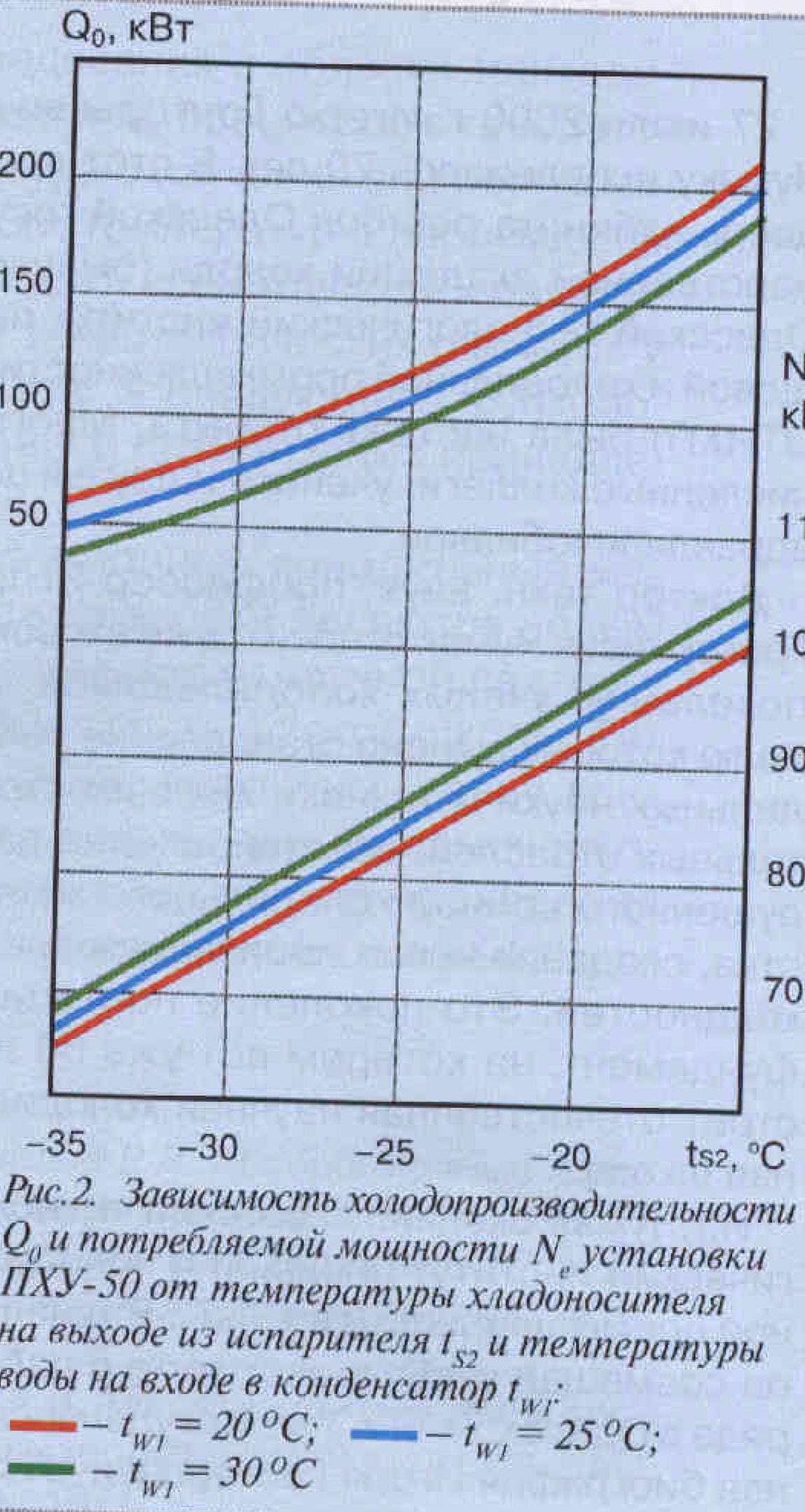 Ниже даны основные технические характеристики установки ПХУ-50, а на рис. 2 - график зависимости холодопроизводительности Qo и потребляемой мощности А/ от температуры хладоносителя на выходе из испарителя и температуры воды на входе в конденсатор tw,.