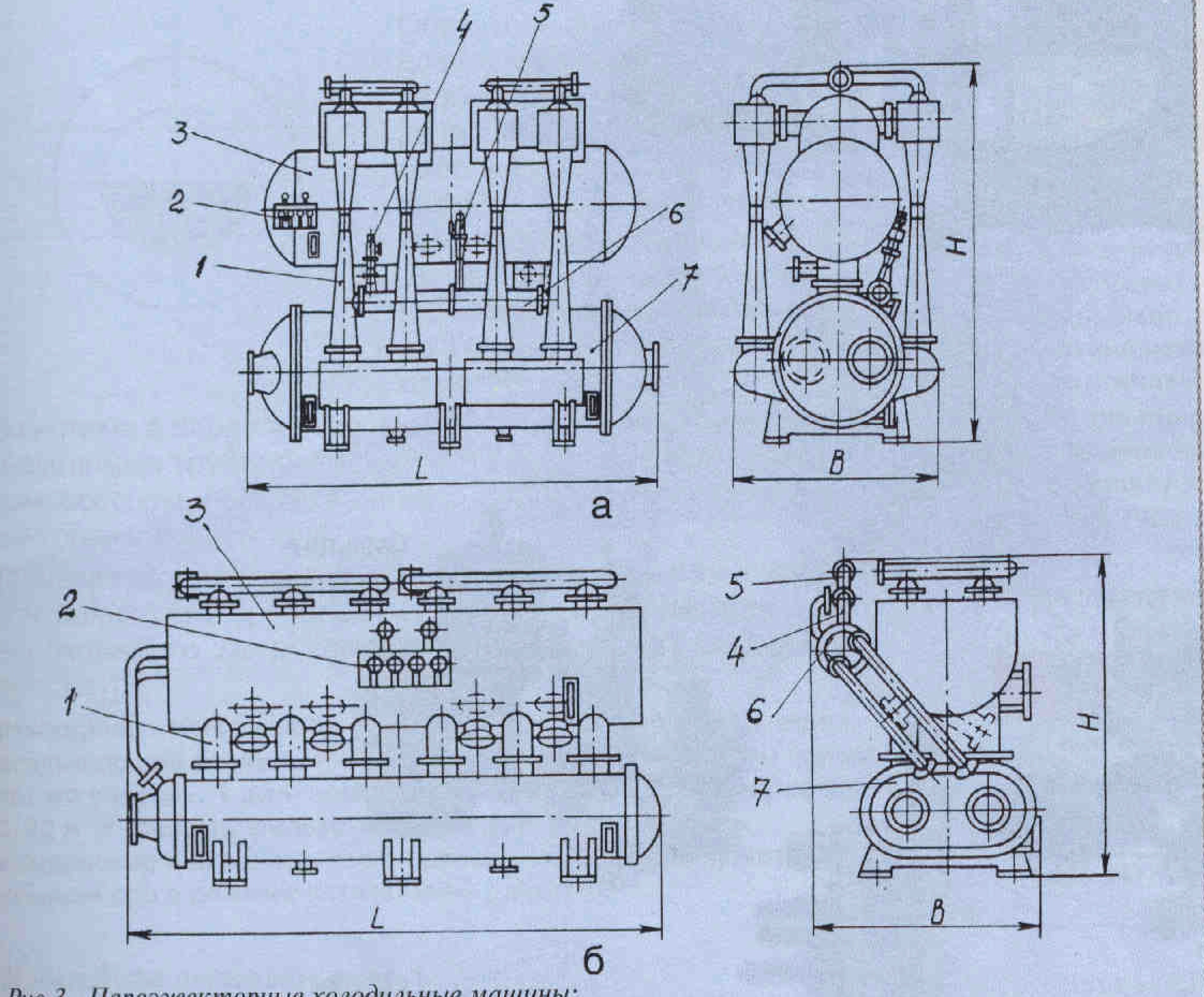 Рис. З. Пароэжекторные холодильные машины: а - машина 16ЭП ( 16ЭПМ); б — машина 18ЭП (18ЭПМ); I - главный эжектор; 2 — щит приборов; 3 — испаритель; 4 — воздушный эжектор II ступени; 5 - воздушный эжектор I ступени; 6 - блок вспомогательных конденсаторов; 7 - главный конденсатор