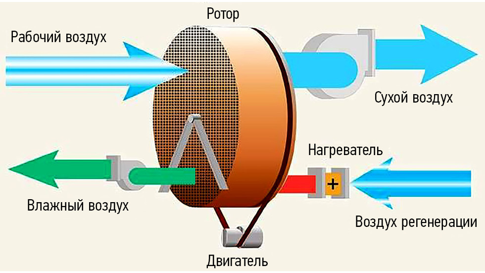 - Сорбционное осушение. Основным элементом является ротор, проходя через который, воздушные массы осушаются и, таким образом, избавляются от лишней жидкости (рис. 1). Система способна функционировать при низких температурах (до -40°С), а также способна справляться даже с экстремальной сыростью и совместима с приборами предварительного охлаждения воздуха, но требует существенных затрат (адсорбционный процесс, воздух проходит через материал, адсорбирующий влагу). Сорбционное осушение имеет свое преимущество, как способ поддержания влажности на ледовых аренах [10–12]: