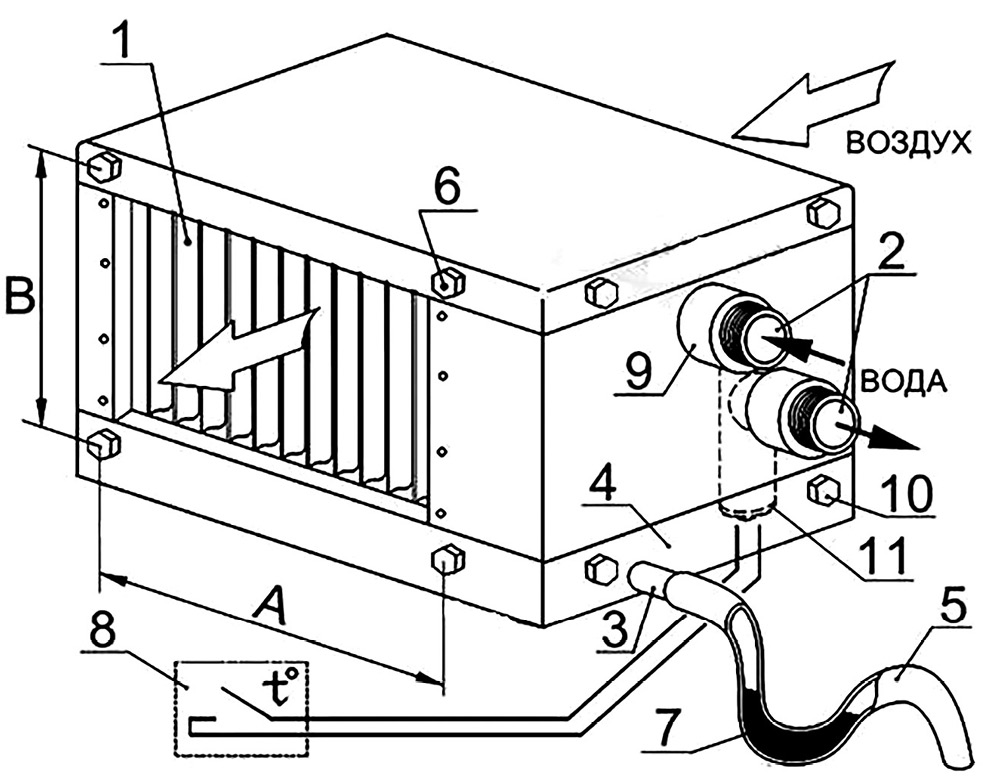 Рис. 3. Теплообменный аппарат водяного охлаждения с каплеуловителем: 1 — пластиковая лопатка каплеуловителя; 2 — патрубки водяных коллекторов; 3 — патрубок слива конденсата; 4 — поддон; 5 — сливной шланг дренажной системы; 6 — монтажный болт (по 4 шт с каждой стороны); 7 — участок засифонирования сливного шланга; 8 — датчик температуры воды; 9 — теплоизоляционное уплотнение; 10 — болты крепления поддона; 11 — заглушка коллектора.