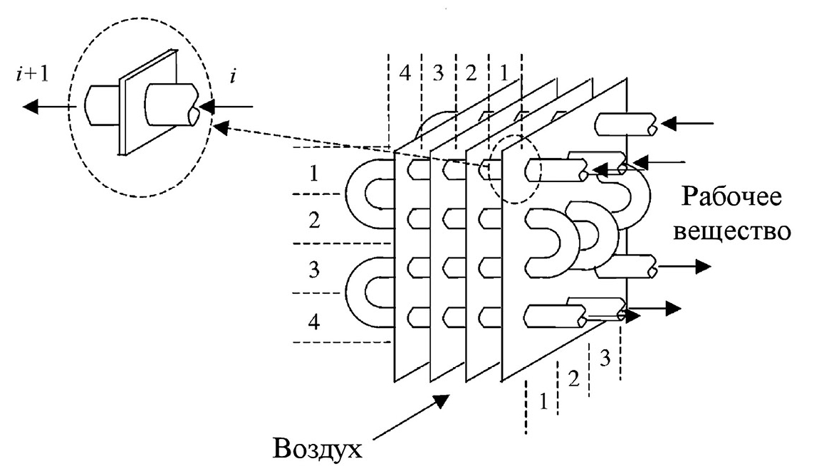 В качестве альтернативной методики расчетов воздухоохладителей для сравнения выбран подход посегментного разбиения: ТОА рассматривается как множество связанных между собой сегментов, режим работы каждого из которых рассчитывается отдельно; при этом выходные параметры рабочих сред предшествующего сегмента являются входными для последующего (рис. 1). К примеру, данный подход использовался в работах [1–3].