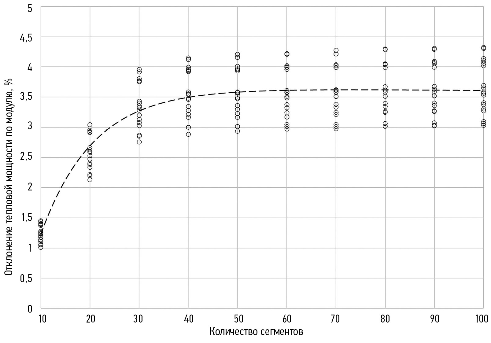 Как отмечалось ранее, разбиение ТОА на сегменты для расчёта не приводит к значимому повышению их точности по сравнению с новым методом — значение отклонения расчётной величины тепловой мощности в среднем составило 3,23% по модулю и не превышает 4,5% по модулю, а напротив, очень существенно увеличивает время выполнения расчётных программ. К примеру, при разбиении ТОА на 40 сегментов время, затраченное на расчёты, увеличивается примерно в 18 раз по сравнению с использованием нового метода.