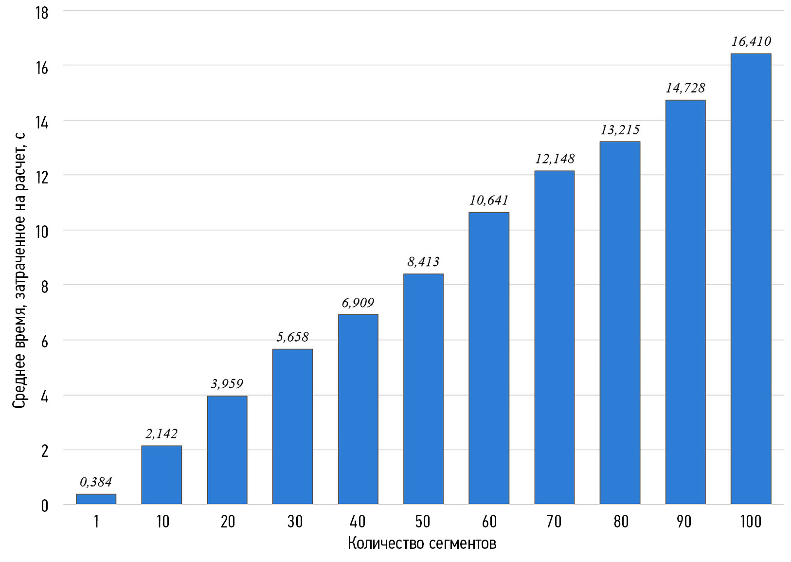 На рис. 2 также хорошо видно, что разбиение ТОА на количество сегментов больше 40 нерационально, так как не ведет к значимому повышению точности расчета. На рис. 3 продемонстрировано усредненное соотношение времени расчетов, где значение для 1 сегмента соответствует вновь разработанному методу. Как видно, посегментное разбиение ТОА приводит к очень значительному увеличению времени выполнения расчетных программ. Например, при разбиении на 40 сегментов оно возрастает приблизительно в 18 раз по сравнению с использованием вновь разработанного метода, что можно назвать существенным преимуществом последнего. Это подтверждает тезис о нерациональности использования метода посегментного разбиения (как минимум при написании ПО для подбора оборудования), так как взамен на многократное увеличение времени, затраченного на расчёт, мы не получим значимого прироста в точности.