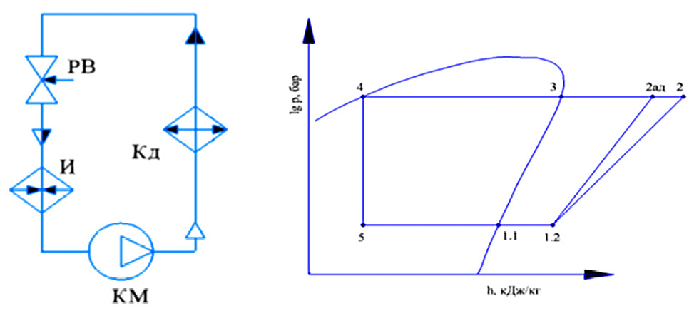 Рис. 1. Принципиальная схема цикла. КМ – компрессор, Кд – конденсатор, И – испаритель, РВ – регулирующий клапан.