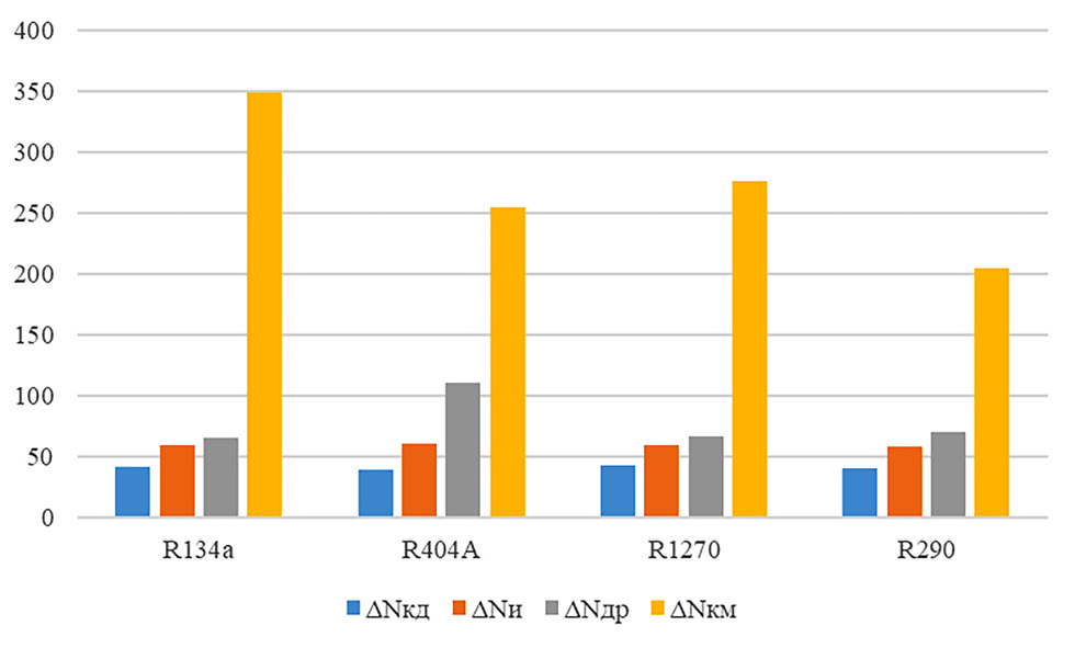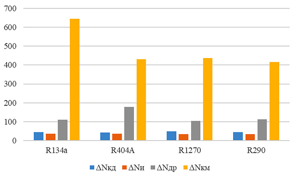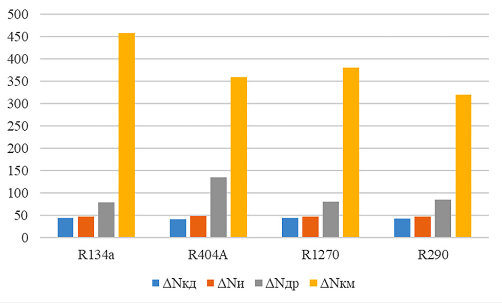 Для сравнения потерь в элементах холодильной установки при использовании разных хладагентов целесообразно использовать потери мощности, определяемые по следующей зависимости:
