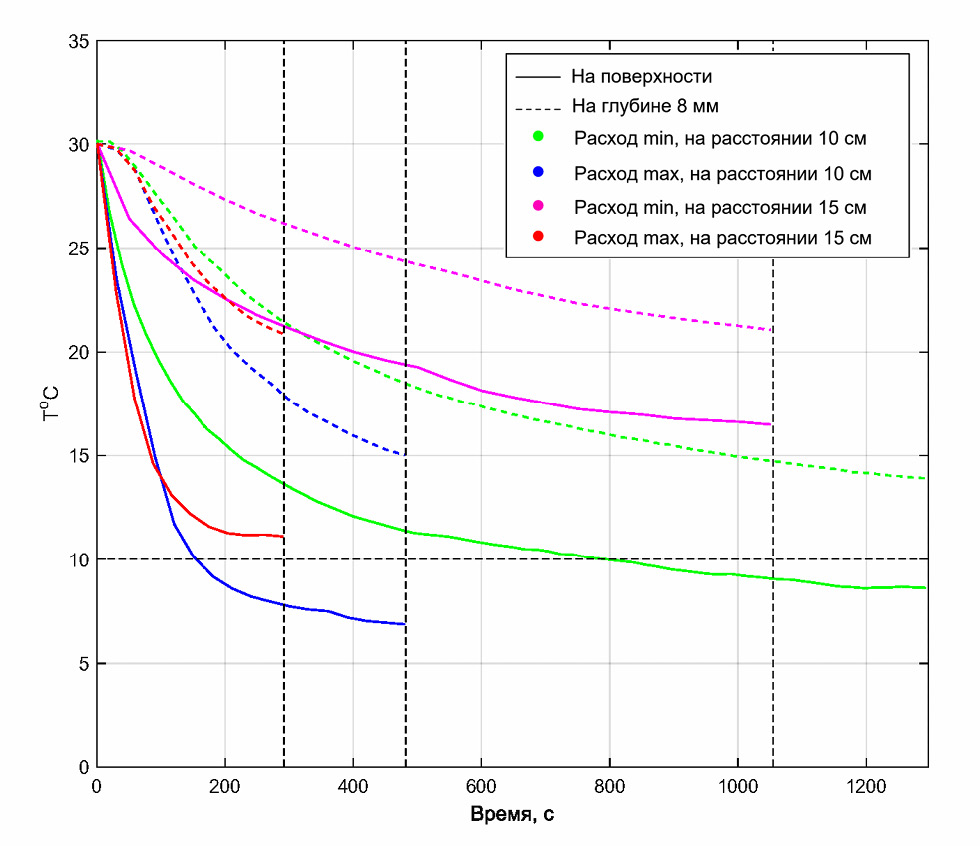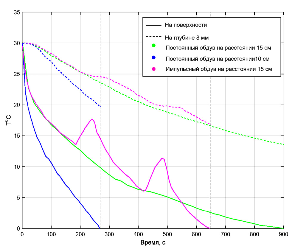 При охлаждении с расстояния 10 см от поверхности с минимальным расходом температура 10 °С была достигнута за 13,3 мин воздействия, а минимальная температура составила 8,6 °С на 21,5 мин. За это время температура на глубине 8 мм понизилась до 16,0 °С и до 13,9 °С соответственно. При охлаждении с расстояния 10 см от поверхности с максимальным расходом температура 10 °С была достигнута за 2,5 мин воздействия, минимальная температура составила 6,9 °С через 8 мин. Температура на глубине 8 мм понизилась до 22,9 и 15,0 °С соответственно. При охлаждении с расстояния 15 см с минимальным расходом температура поверхности снизилась до 16,5 °С за 17,5 мин, температура на глубине 8 мм составила 21,1 °С. Дальнейшее изменение температуры было незначительным. В случае обдува с расстояния 15 см с максимальным расходом, температура достигла минимального значения 11,1 °С за 4,8 мин, а на глубине 8 мм температура снизилась до 20,9 °С.