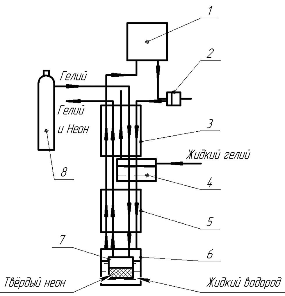 Рис. 1. Cхема разделения Ne и He методом конденсации с помощью жидкого водорода 1 – Ресивер смесевого газа. 2 – Компрессор; 3 – Теплообменник; 4 – Азотная ванна: 5 – еплообменник; 6 – Водородная ванна; 7 – Десублиматор; 8 – Гелиевый баллон.