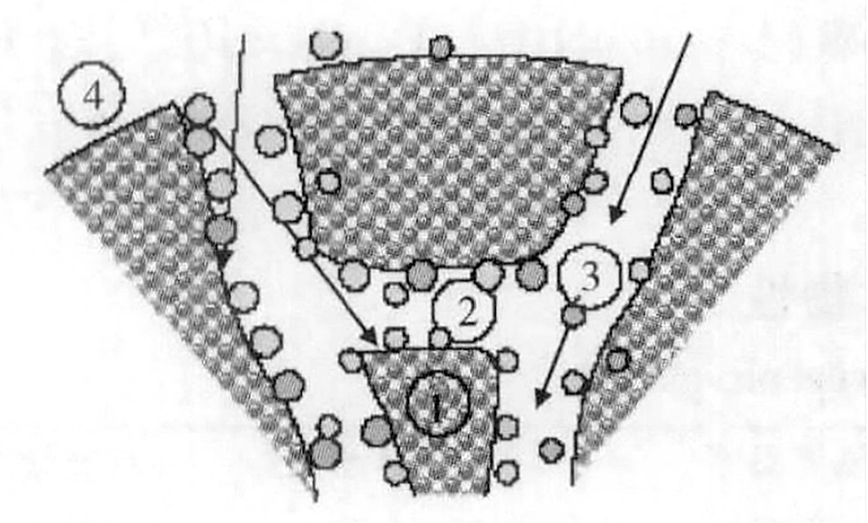 Fig. 2. Scheme of diffusion of a gaseous molecule on an adsorbent 1 – Internal surface diffusion of adsorbent; 2 – Surface adsorption; 3 – Diffusion of mobile phase into other pores; 4 – Diffusion of mobile phase on and around external surface [5].
