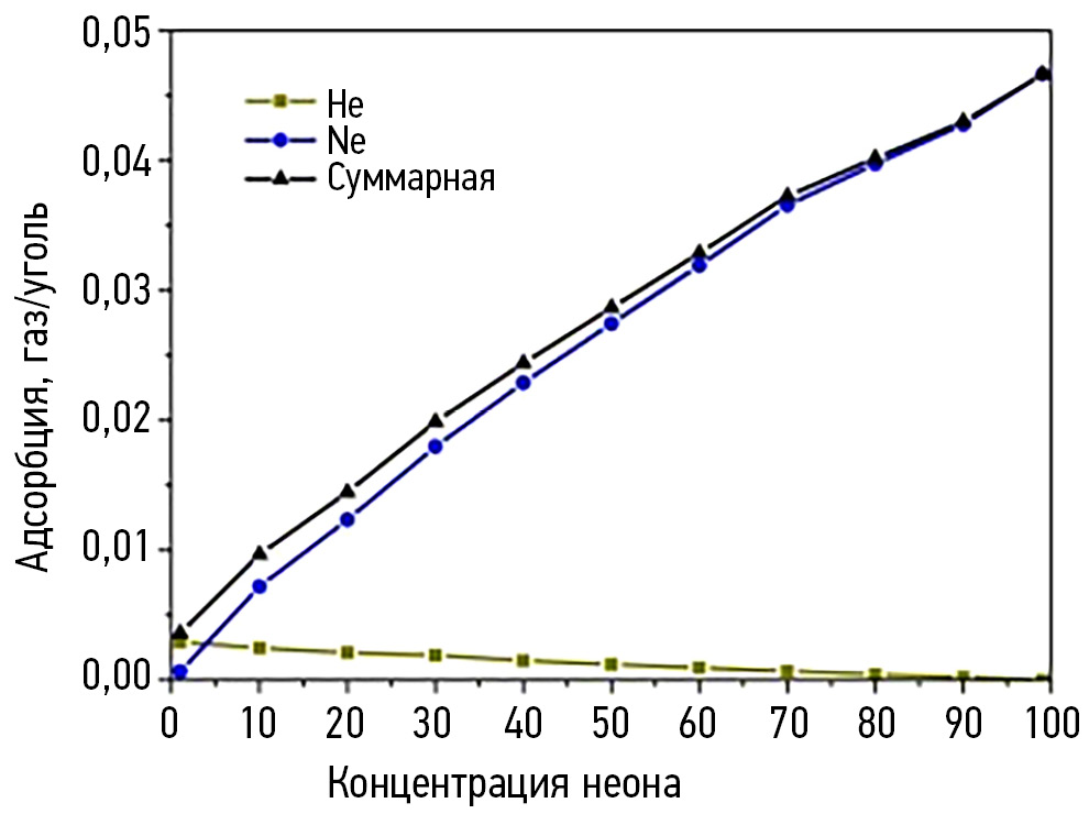 В разных исследованиях упоминаются адсорбенты, которые пригодны для удаления неона в неоногелиевой смеси, например, активированные угли марками СКТ-4, СКТ-6, АГ-2, БАУ, ПАУ, цеолиты марками NaX, CaA и силикагели. Следует отметить, что для силикагелей отсутствуют данные по изотермам и другим показателям адсорбции [9, 13].