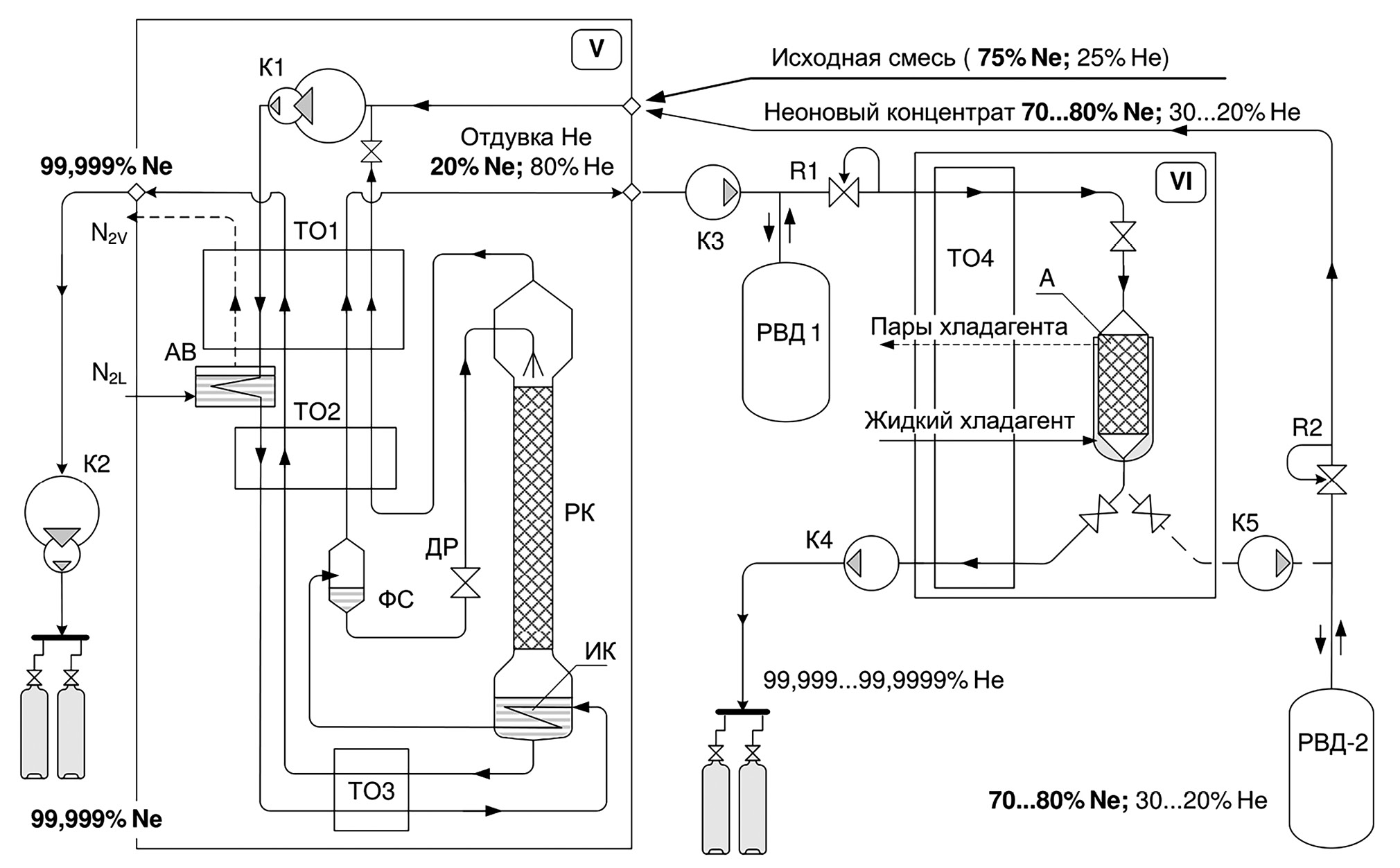 Рис. 3 Классическая схема комплекса для получения неона и гелия высокой чистоты Блоки V – Ректификационная установка; VI – Адсорбционный блок. ТО1–ТО4 – теплообменники; АВ – азотная ванна; ИК – змеевик в кубе колонны; выполняющий функции испарителя-конденсатора; ФС – фазовый сепаратор; РК – ректификационная колонна; А – адсорбер; РВД1, РВД2 – ресиверы высокого давления; R1, R2 – редукторы; К1…К5 – мембранные компрессоры.