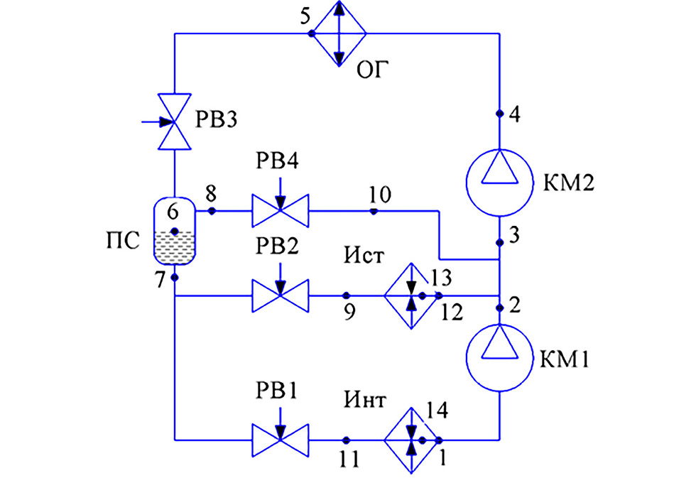 Рис. 1. Принципиальная схема транскритической холодильной системы СО2 (Система 3): КМ1 – компрессор первой ступени сжатия, КМ2 – компрессор второй ступени сжатия, ОГ – охладитель газа, ПС – промежуточный сосуд, Ист – испаритель среднетемпературных потребителей, Инт – испаритель низкотемпературных потребителей, РВ1, РВ2, РВ3, РВ4 – регулирующие вентили.