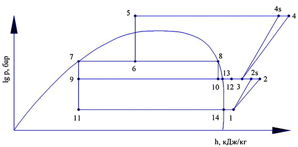 Расчеты классических холодильных циклов представлены в учебнике [1]. Для решения конкретной задачи требуется произвести анализ эффективности транскритического цикла.