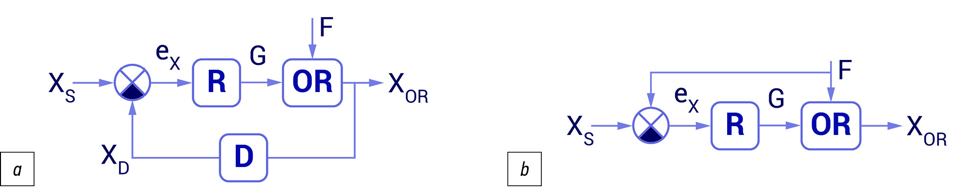 Рис. 1. Структурные схемы регуляторов, построенных на принципах по отклонению (а) и по возмущению (b). Обозначения на схеме: R – регулятор, OR – объект регулирования, D – датчик, Xs – уставка целевого параметра, XOR – целевой параметр регулирования, XD – показания датчика, ex – ошибка регулирования, F – внешнее воздействие, G – управляющее воздействие.