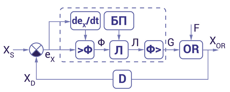 Рис. 2. Структурная схема регулятора с нечеткой логикой. Обозначения на схеме: OR – объект регулирования, D – датчик, БП – база правил, >Ф – фаззификатор, Ф> – дефаззификатор, Л – логический вывод, Xs – уставка целевого параметра, XOR – целевой параметр регулирования, XD – показания датчика, ex – ошибка регулирования, Ф – фаза регулирования, F – внешнее воздействие, G – управляющее воздействие.