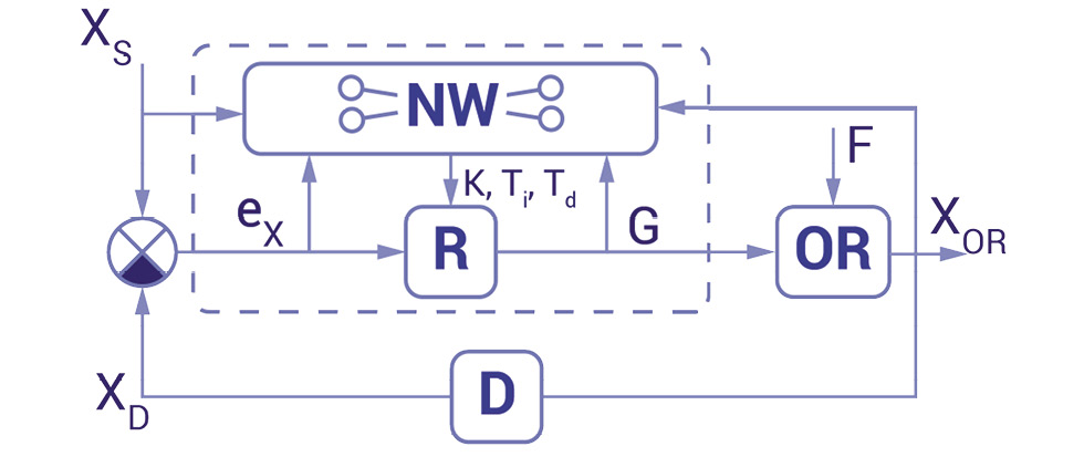Fig. 3. Structural diagram of a PID controller with a neural network for adjusting the coefficients. Designations in the diagram: R – controller, OR – control object, D – sensor, NW – neural network, Xs – target parameter setting, XOR – target control parameter, XD – sensor readings, ex – control error, F – external influence, G – control action, K, Ti, Td – the corresponding coefficients of the PID controller.