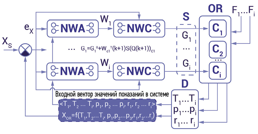 - ошибка регулирования, вектор-столбец значений показаний в системе и веса влияния исполнительных устройств подаются на вход в нейронный сетевой контроллер NWC, который формирует стратегию регулирования S на основании предсказания следующего состояния системы: