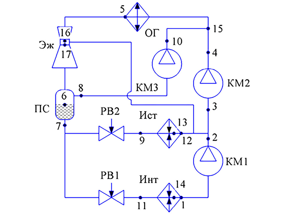 Пары хладагента, образовавшиеся при кипении на низком температурном уровне в испарителе Инт от тепловой нагрузки Qнт, сжимаются компрессором нижней ступени КМ1 от давления точки 1 до давления точки 2. Смешиваются с парами хладагента, образовавшимися при кипении хладагента на среднем температурном уровне в испарителе Ист от тепловой нагрузки Qст. При этом часть паров отбирается эжектором Эж. После этого происходит сжатие в компрессоре второй ступени КМ2 от давления точки 3 до давления точки 4.