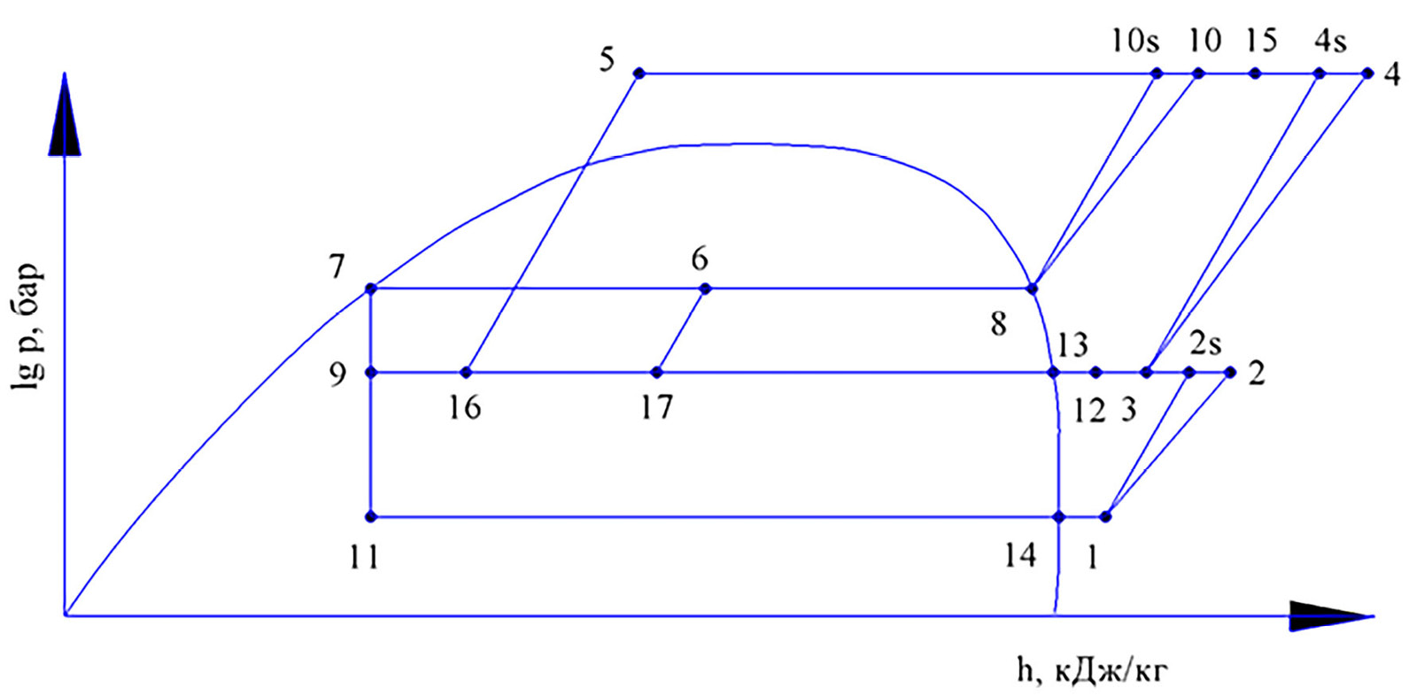 Далее насыщенная жидкость точки 7 дросселируется до среднетемпературного и низкотемпературного уровней в РВ2 и РВ1 соответственно. После чего цикл повторяется.