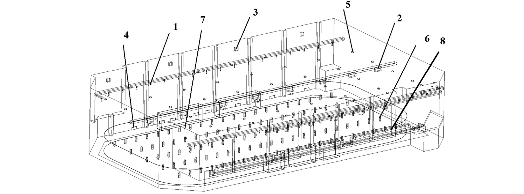 Fig. 1. General layout of the ice arena geometric model. 1 – nozzles of supply ventilation; 2 – exhaust openings, 3 – air heaters; 4 – central heating batteries; 5 – lighting; 6 – players; 7 – ice surface; 8 – spectators.