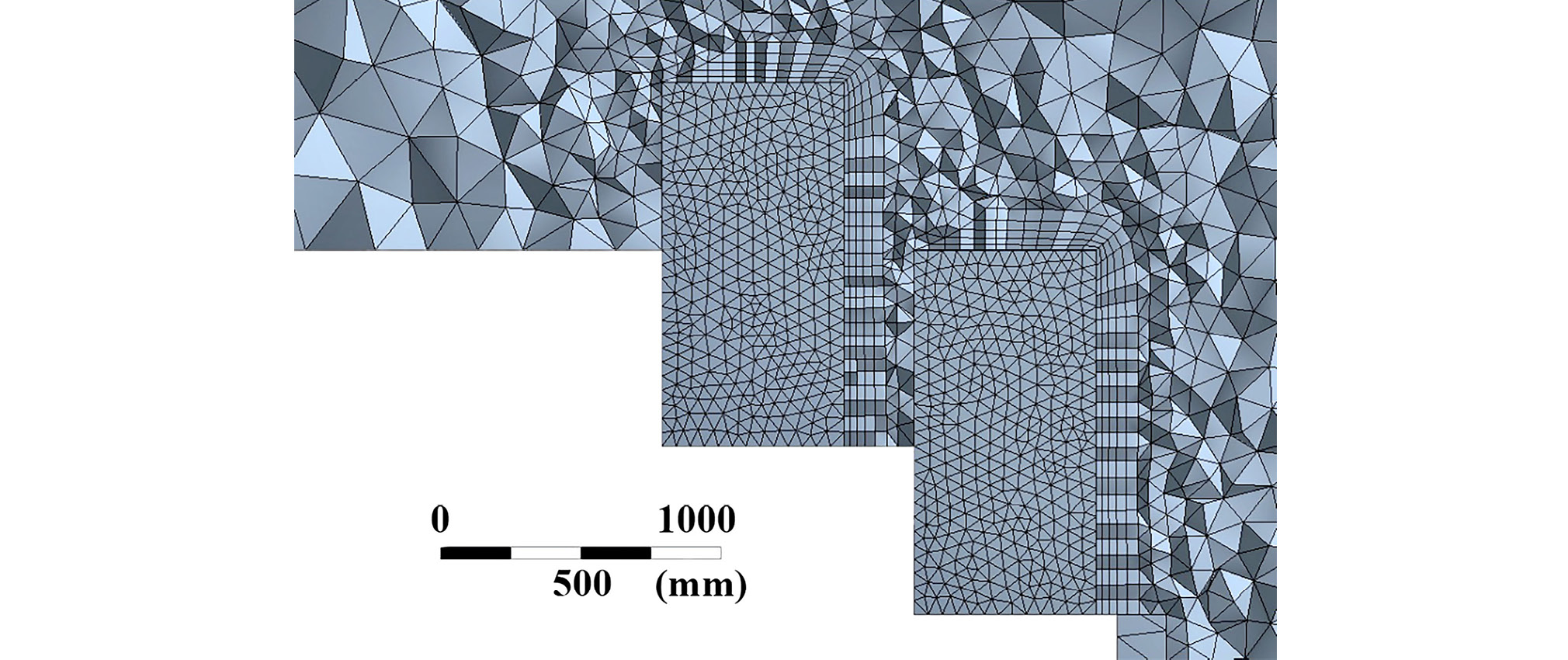 Рис. 2. Сетка конечных элементов в зоне зрительских трибун. Показаны измельчение элементов в форме тетраэдра в зоне граничных условий и пограничные слои призматической формы, непосредственно примыкающие к граничному условию.