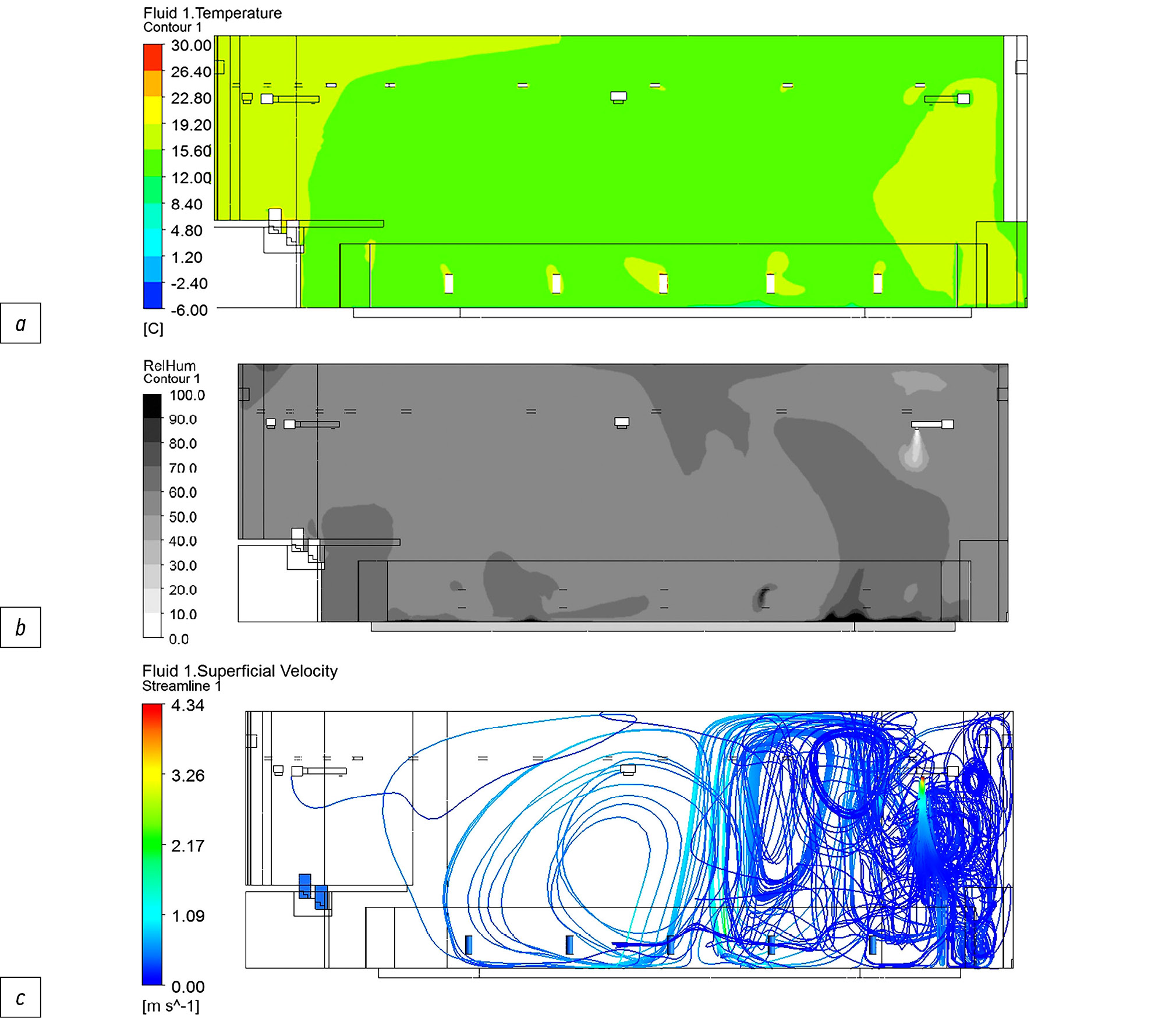 MATERIALS AND METHODS: ANSYS CFX software was used for modeling, using the finite volume method for calculations. The object of the study was a digital twin of a small training ice arena, making it possible to take into account the thermal-physical processes occurring in the room. Analysis was performed for the steady-state (stationary) heat and mass transfer condition. The modeling results were evaluated by considering air temperature and humidity contours in the most characteristic secant planes. Given that the direct determination of air humidity was not possible using the software package, a description of a method for the determination of humidity by empirical equations was provided.