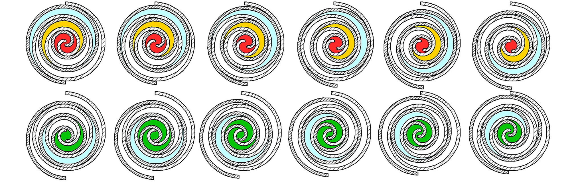 Рис. 2. Изменение положения полостей сжатия за один оборот вала с шагом 30° (π/6).