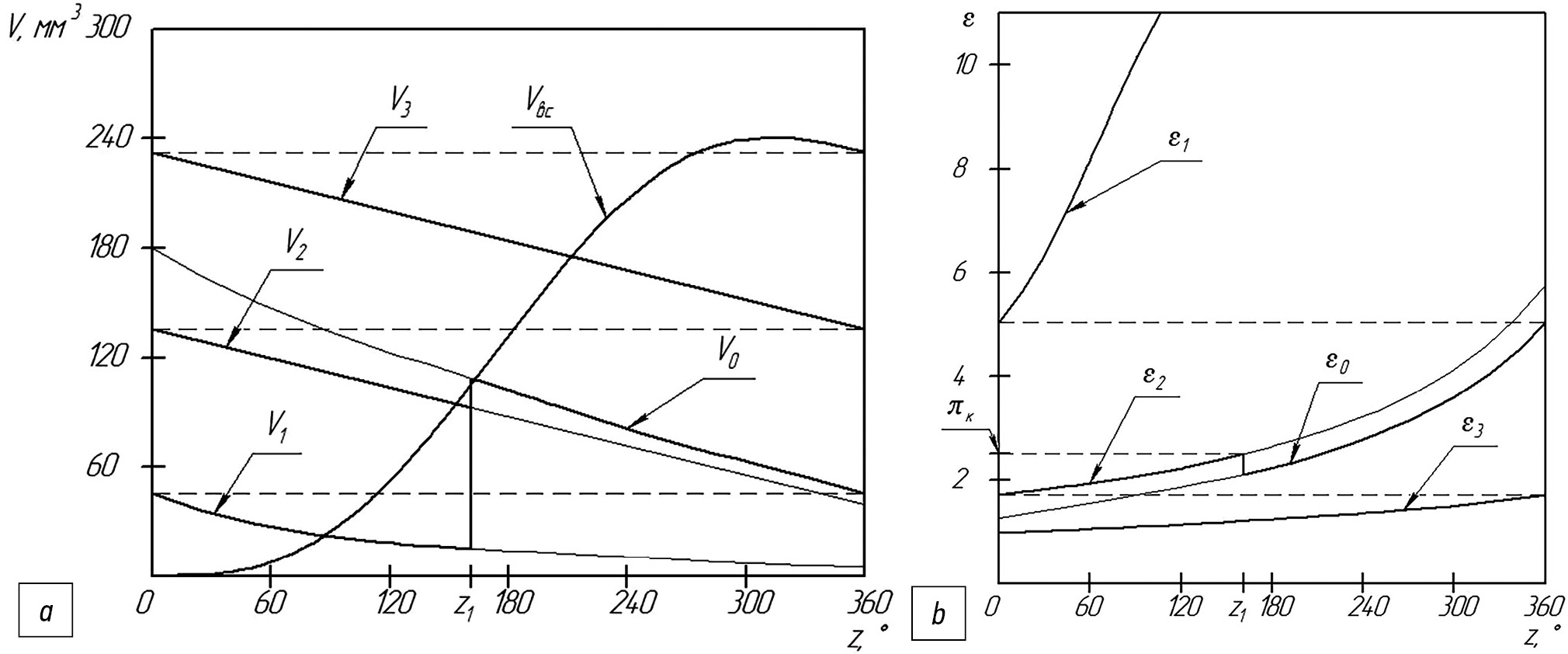 Каждая полость характеризуется степенью сжатия, являющейся отношением объема полости к начальному объему всасываемого газа. Начальный объем газа был найден из зависимости (3) при угле поворота вала z=0. Графики изменения объемов (a) и степени сжатия в парных полостях (b) в зависимости от угла поворота вала представлены на рис. 3.