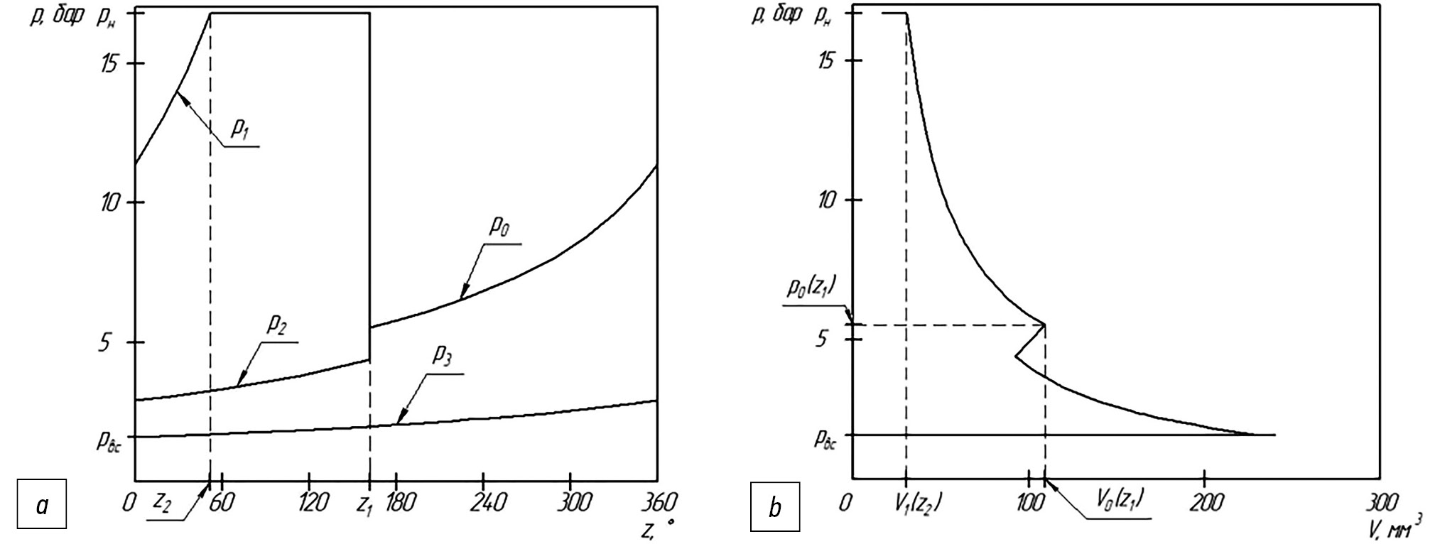 Таким образом, изменение давления в парных полостях было рассчитано следующим образом: давление в третьей полости меняется в соответствии с формулой (5), давление во второй полости до угла z1 изменяется аналогично, при образовании полости 0, давление в ней меняется скачкообразно на давление, рассчитанное в соответствии с формулой (6), затем сжатие продолжается по политропному закону (5). При повороте вала на 360 градусов происходит разъединение полостей, причем начальный объём первой полости равен конечному объёму полости 0. В первой полости происходит дожатие газа до давления нагнетания по политропному закону, затем открывается нагнетательное отверстие и происходит выпуск газа. График изменения давления в полостях сжатия компрессора в зависимости от угла поворота вала (a) и индикаторная диаграмма (b) представлены на рис. 4.