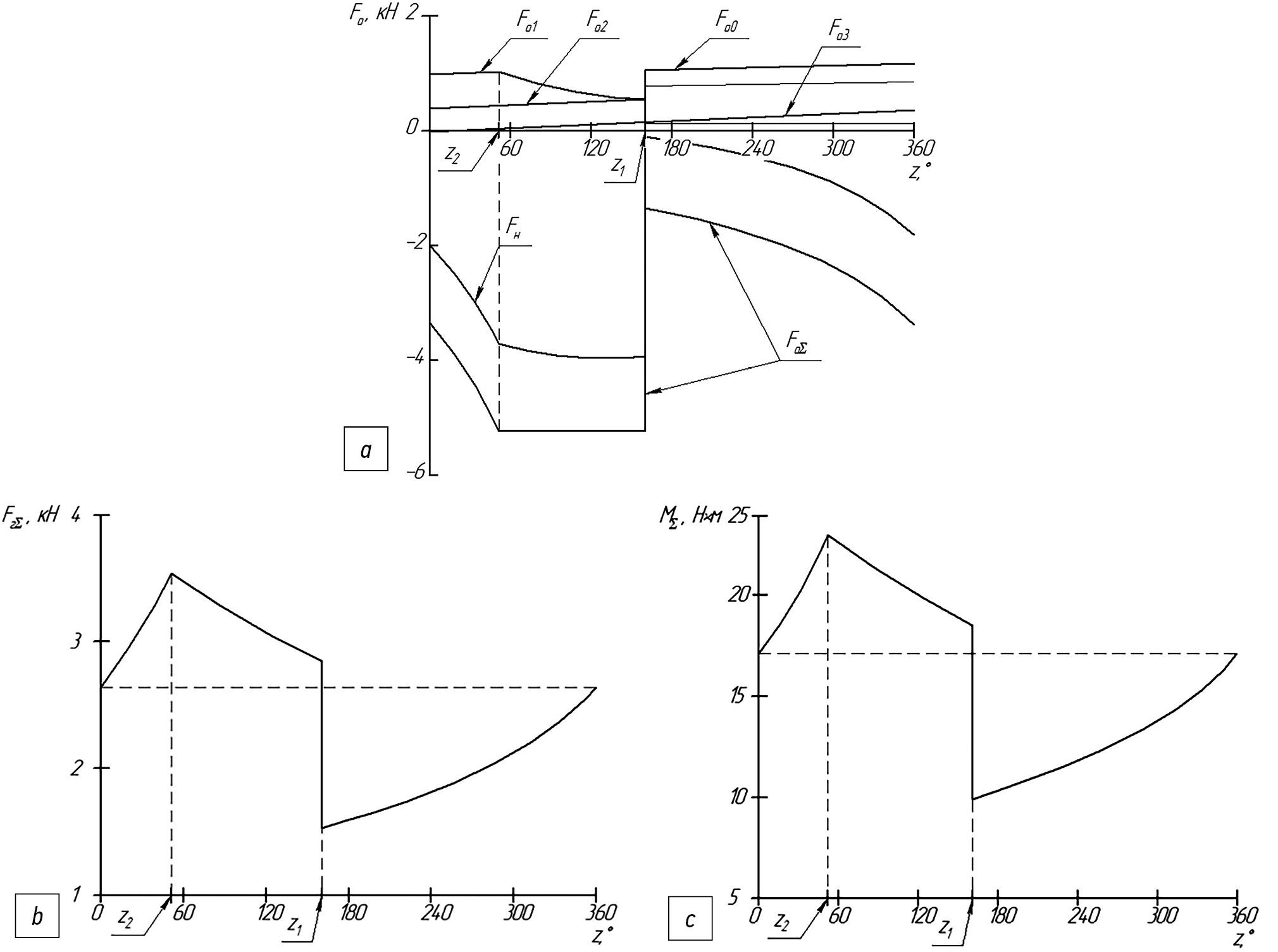 Рис. 5. Осевые силы (a), суммарная газовая сила (b), суммарный момент на валу (c).