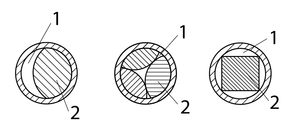 Fig. 2. Variants of TT geometry (1 — steam channel, 2 — wick).