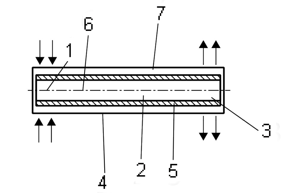 Рис. 3 Тепловая труба Гровера (1 — зона испарения, 2 — зона транспорта пара, 3 — зона конденсации, 4 — корпус, 5 — КПМ, 6 — паровой поток, 7 — возврат конденсата).