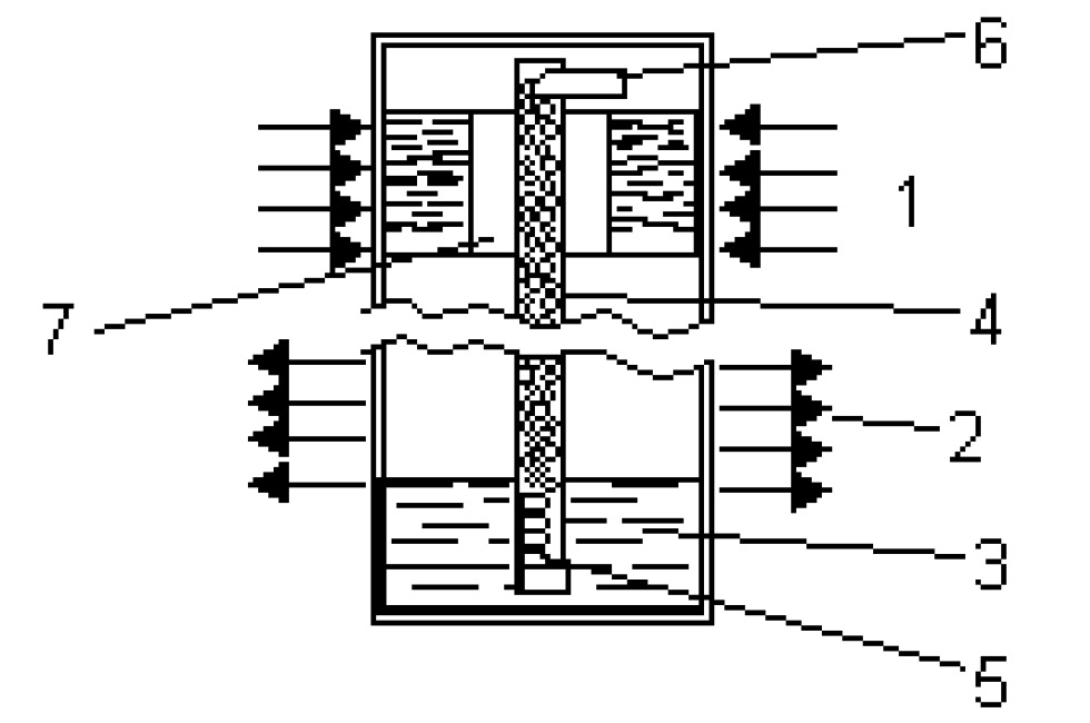 Рис. 4 Антигравитационный термосифон (1 — зона испарения, 2 — зона конденсации, 3 — жидкость, 4 — эрлифтовая труба, 5 — электронагреватель, 6 — выходное отверстие, 7 — кольцевой канал).