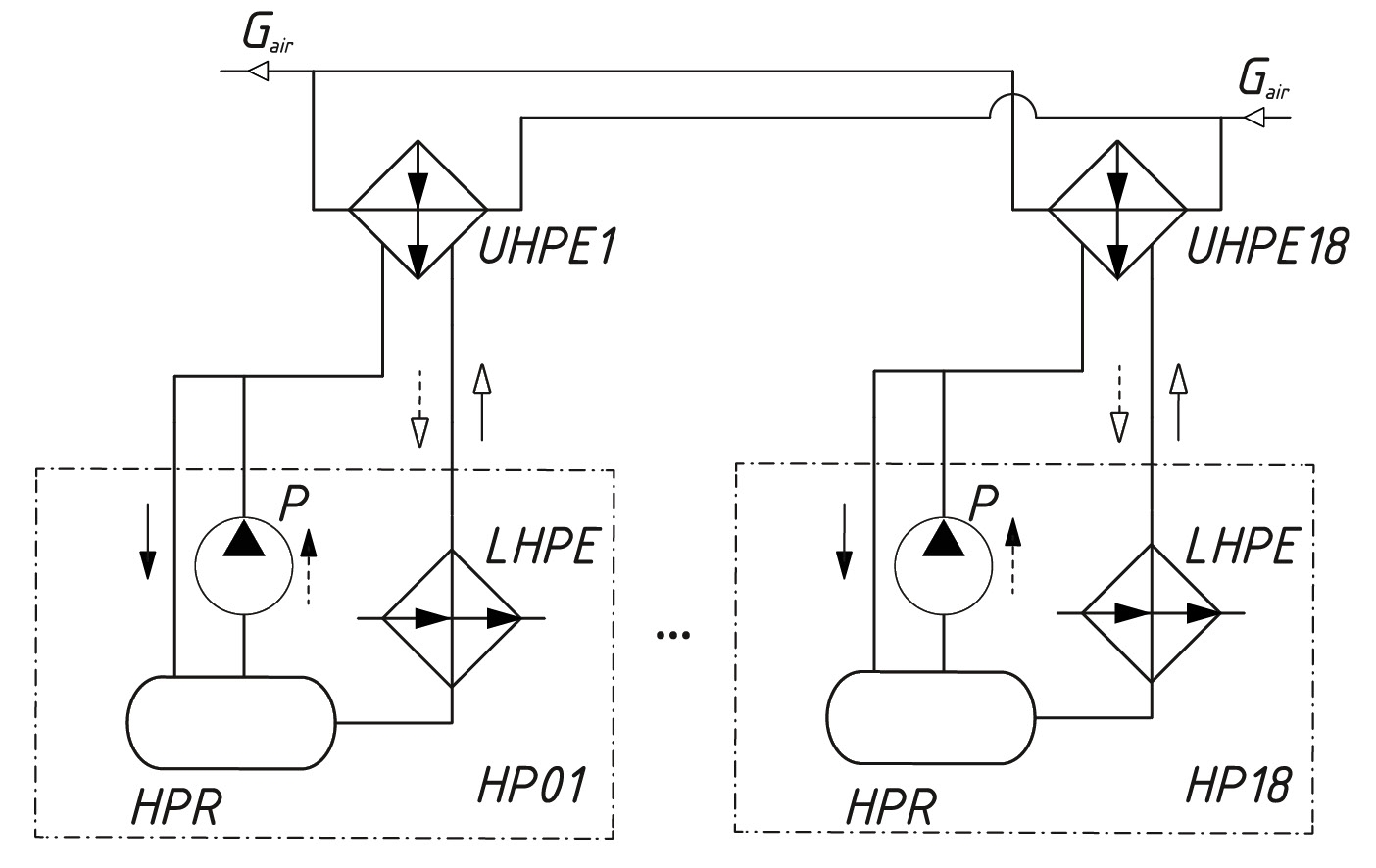 Рис. 5 Система тепловых труб с погружными насосами (UHPE — upper heat pipe exchanger (верхний теплообменный аппарат тепловой трубы), LHPE — lower heat pipe exchanger (нижний теплообменный аппарат тепловой трубы), P — pump (насос), HP — heat pipe (тепловая труба), HPR — heat pipe receiver (ресивер тепловой трубы))