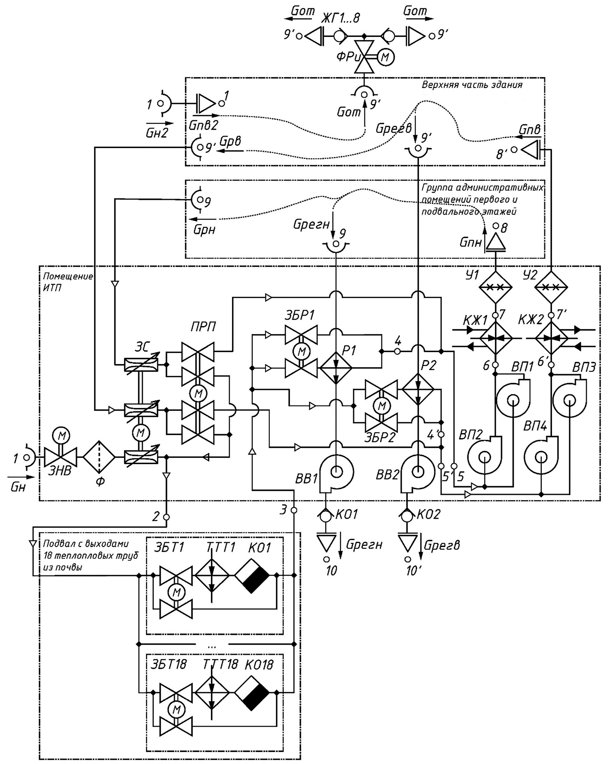 На следующем этапе была составлена пневмогидравлическая схема, предлагаемой системы отопления, вентиляции и кондиционирования воздуха, представленная на рис. 2. Отметим, что здесь рассматривался вариант высоко энергоэффективной системы, максимально использующей теплоту окружающей среды.
