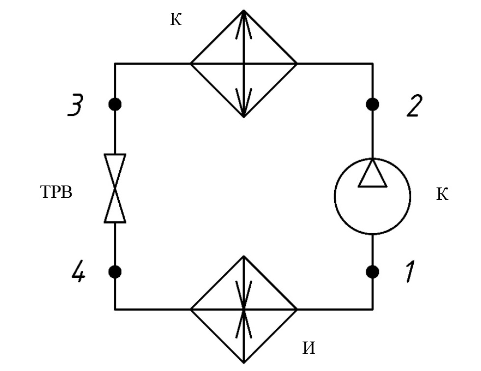 Fig. 1. Schematic of a simple vapor–compression cycle. Km — compressor, K — condenser, ТРВ — thermostatic control valve (throttle), and И — evaporator.