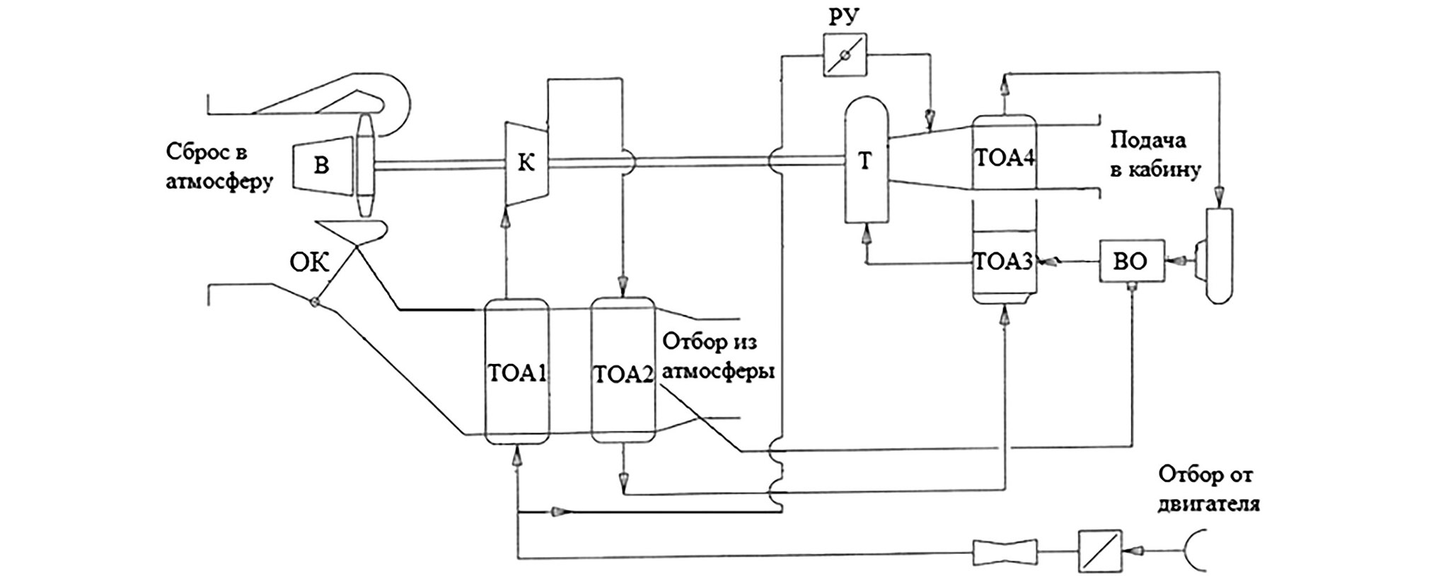 Fig. 1. ACS scheme. V — air cycle machine fan stage; VO — water collector; K — compressor stage of the air cycle machine; OK — check valve; RU — control device for bypassing working air; T — expander stage of the air cycle machine; TOA 1 — primary heat exchanger; TOA 2 — secondary heat exchanger; TOA 3 — reheater; ТОА 4 — condenser.
