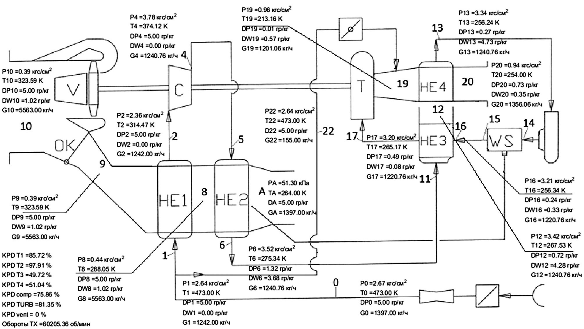 Координация работы этих двух блоков идет так же через подбор параметров (входное давление, частота вращения вала турбохолодильного агрегата, регулировка обвода воздуха, если СКВ работает на режиме обогрева). Таким образом, расчет всей системы на каком-либо режиме происходит за счет множества последовательных итераций. В результате расчета математическая модель выдает параметры в каждой их своих точек, которые в дальнейшем и будут использованы для анализа работы всей системы в целом. Пример рассчитанной схемы приведён на рис. 2.