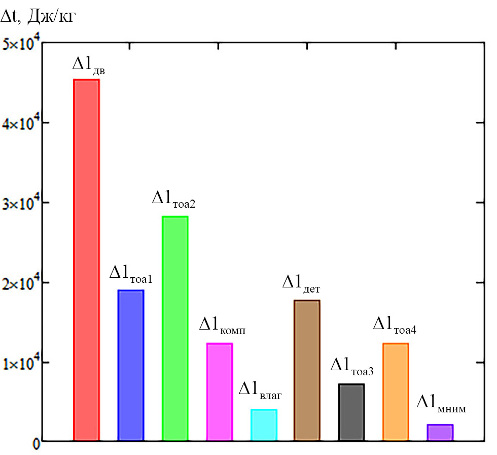 При разработке и производстве СКВ важно иметь подробное представление о работе такой системы. Для каждой СКВ необходимо проводить свой термодинамический расчет и анализ работы такой системы. В большинстве случаев эффективность работы СКВ анализируют по её энергопотреблению (а точнее, в основном по потреблению горячего воздуха). В МГТУ им. Н.Э. Баумана активно используется метод энтропийно-статистического анализа, с помощью которого можно подробно проанализировать работу СКВ на режимах охлаждения. Данный метод позволяет определить узлы, потери в которых имеют наибольшее влияние на эффективность СКВ, а также позволяет оценить перспективу улучшения этих узлов. В данной статье этот метод применен для анализа наземного режима охлаждения самолета, как наиболее нагруженного для СКВ. Методика расчета взята на основе работы [4]. Результаты расчета наземного режима СКВ по математической модели представлены в таблице 1.