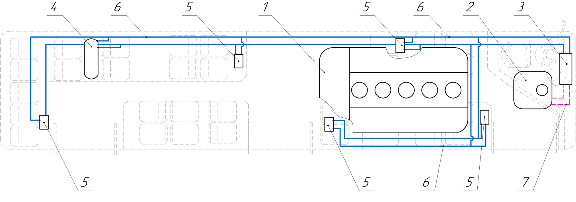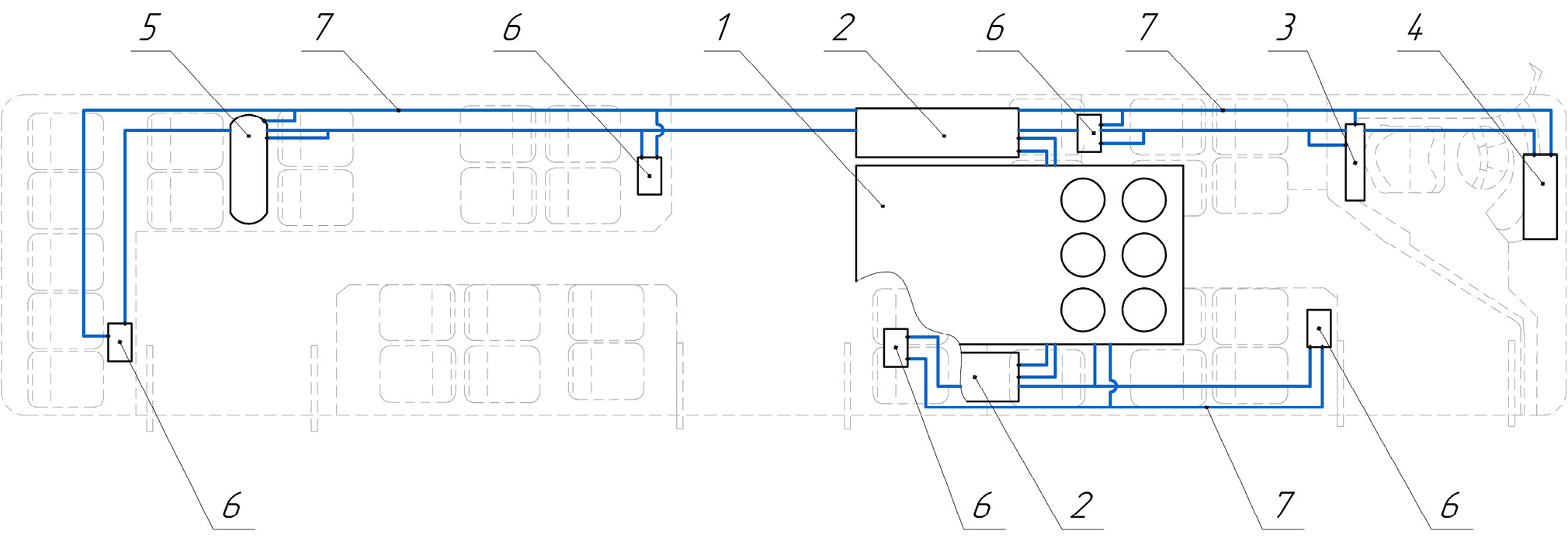 Рис. 3. Схема климатической системы компаний Heavac 1 — Крышевая установка; 2 — Крышевые фанкойлы; 3 — Задний отопитель кабины; 4 — Фронтальный отопитель кабины; 5 — Подогреватель жидкостной дизельный или электрический; 6 — Зависимые салонные отопители; 7 — Трубопроводы теплоносителя.