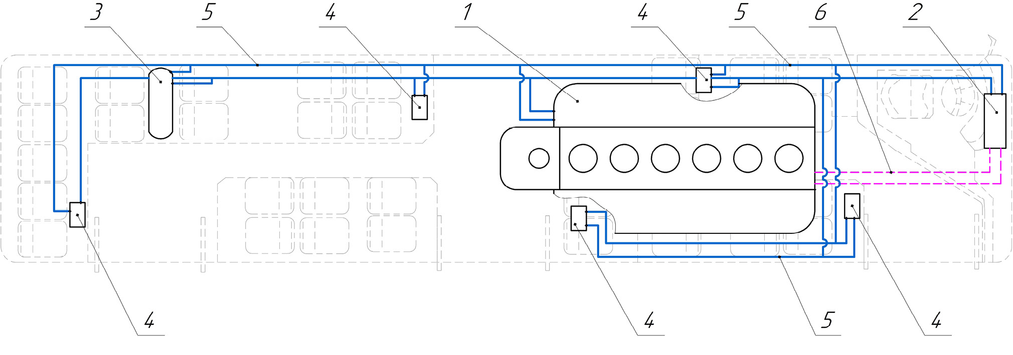 Рис. 2. Схема климатической системы компаний Thermo King и Eberspaecher 1 — Крышевая установка салона; 2 — Фронтальный отопитель с испарителем; 3 — Подогреватель жидкостной дизельный или электрический; 4 — Зависимые салонные отопители; 5 — Трубопроводы теплоносителя; 6 — Трубопроводы хладгента.