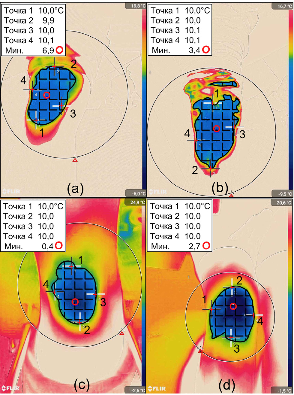 Минимальная конечная температура, зарегистрированная с помощью тепловизора, была ниже измеренной при использовании температурного датчика. Область с минимальной температурой находится в области надколенника, но не совпадает с местом крепления датчика. Минимальная температура была зафиксирована для оценки риска повреждения кожного покрова. А показания температуры с датчика были сняты для оценки динамики изменения температуры.
