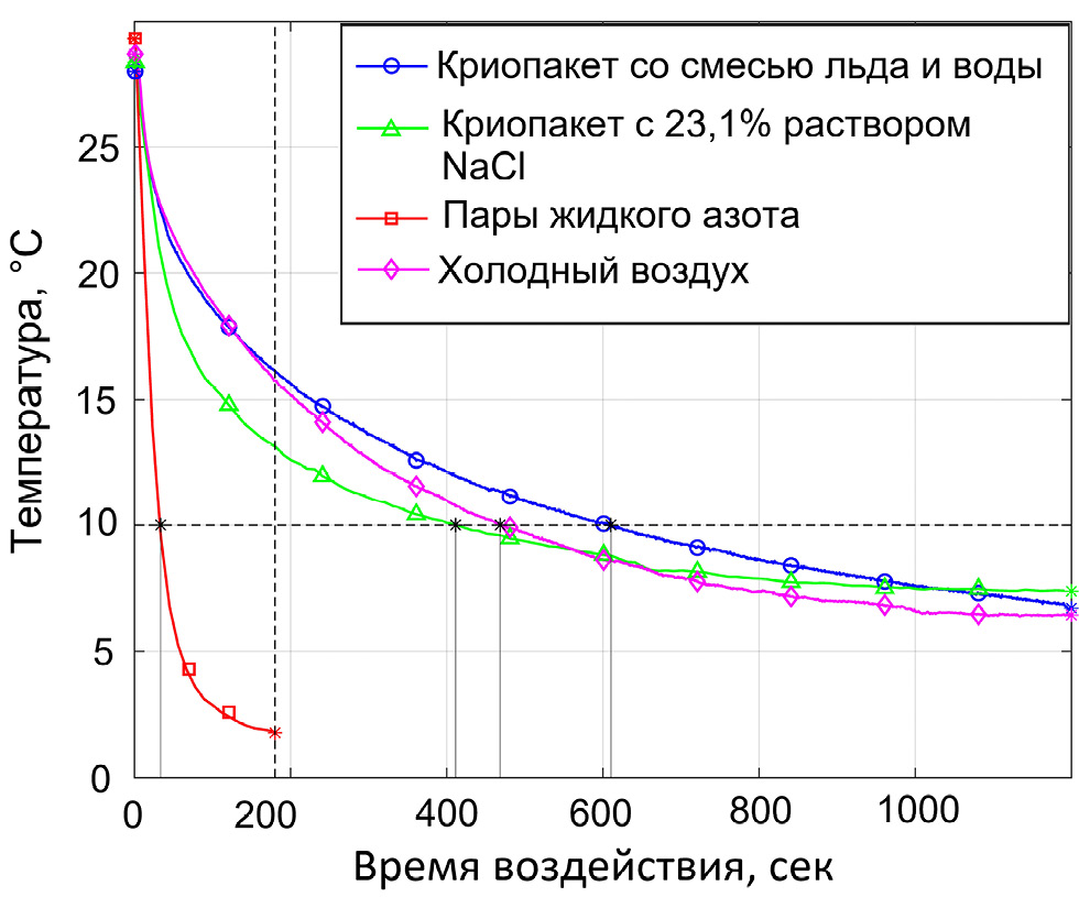 Измеренные температуры и скорость охлаждения показывают, что использование азотного охлаждения значительно отличается от других рассмотренных способов. Следовательно, важно понять, как правильно использовать преимущество жидкого азота — низкую температуру кипения. При исследуемом режиме способ обеспечил достижение целевой температуры, не повреждая кожный покров. Однако, зона воздействия была меньше площади поверхности коленного сустава.